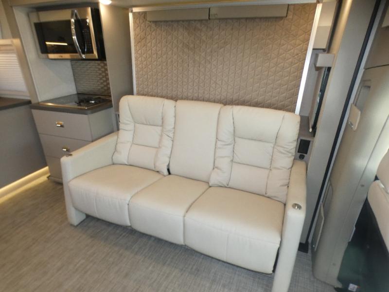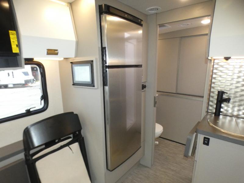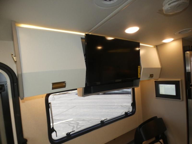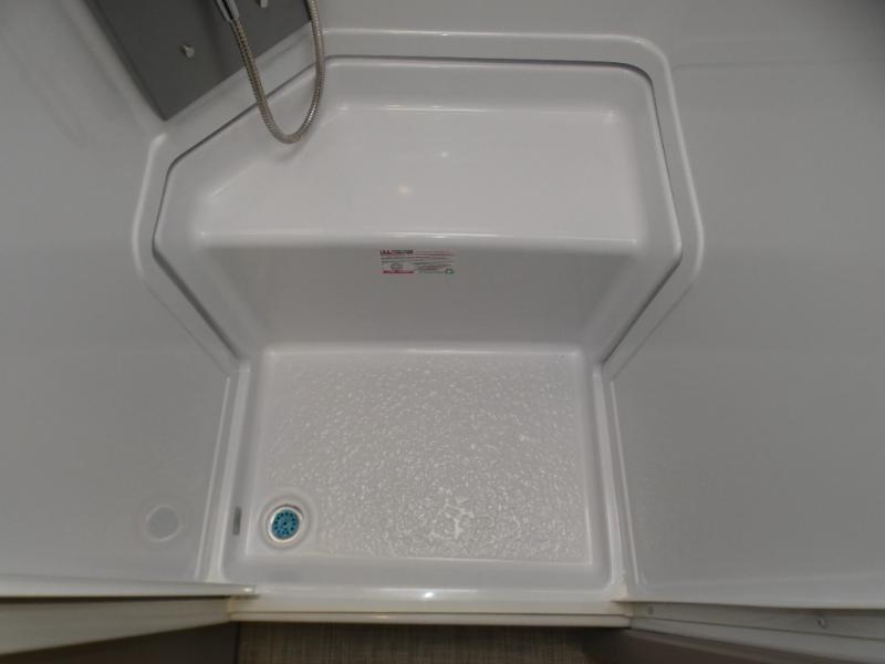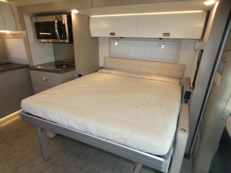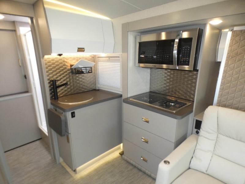 The View is a perfect couples coach! This versatile Murphy bed unit will offer you sleeping space when you need it, then a comfortable living area during the day with plenty of seating all while keeping your same coach length. You will be able to easily set up the queen Murphy+ bed when it's time for bedtime. Everyone can get cleaned up in the full bathroom that has a space-saving sliding door and large wardrobe along the very rear that features a gear garage below. Create yummy meals and snacks using the kitchen appliances and the flip-up counter, then dine at the fold-down table with chairs, or eat seated on the theater seating with lap tables nearby on either side.