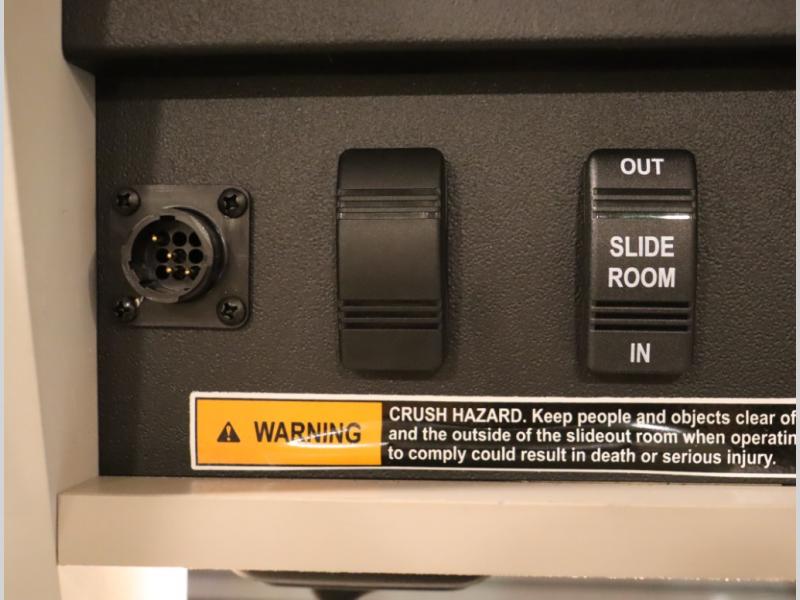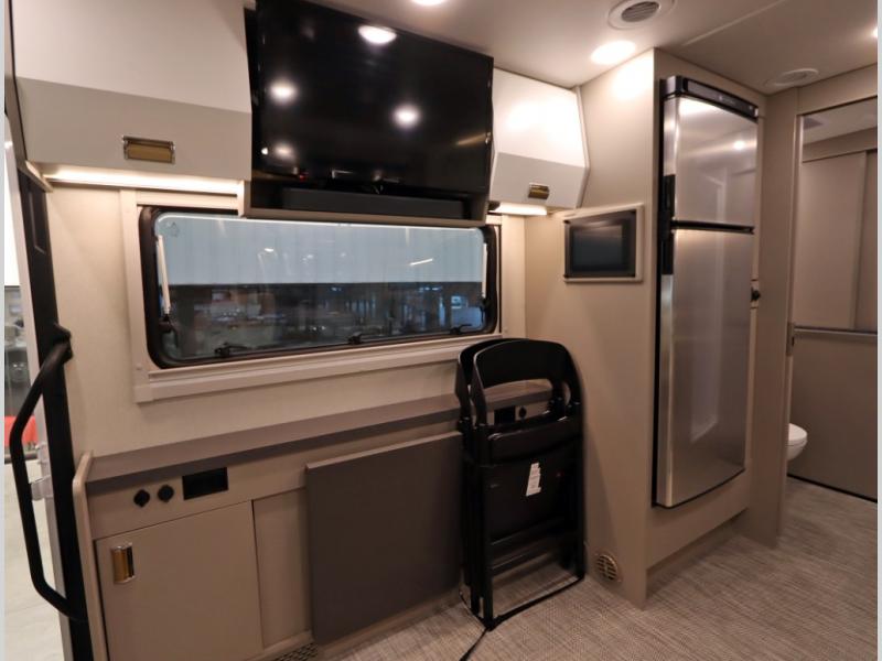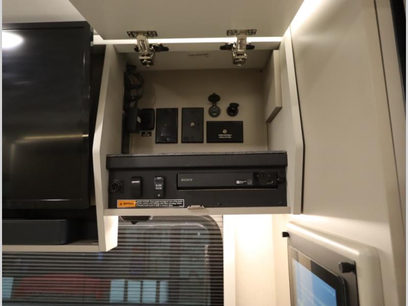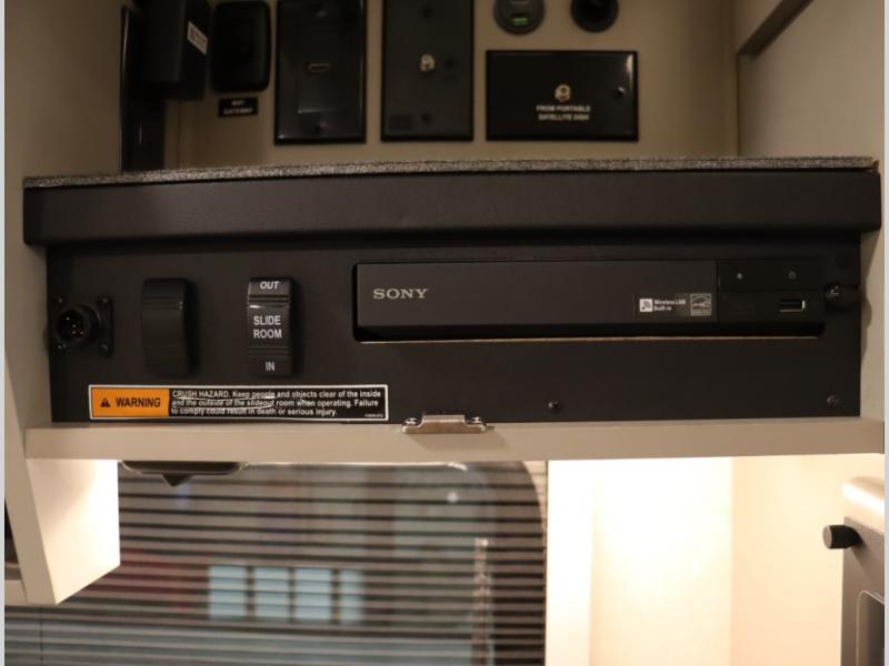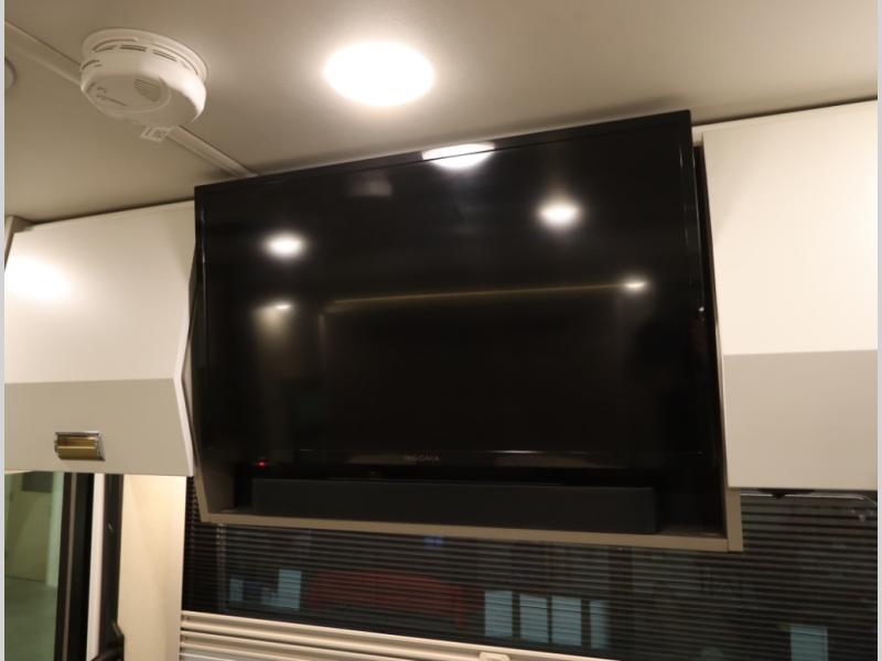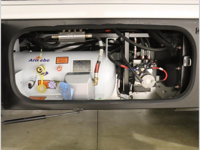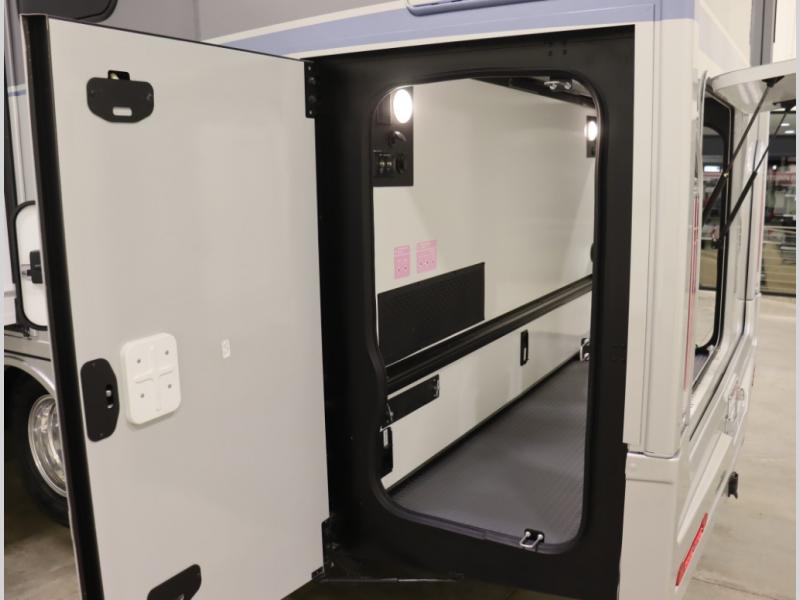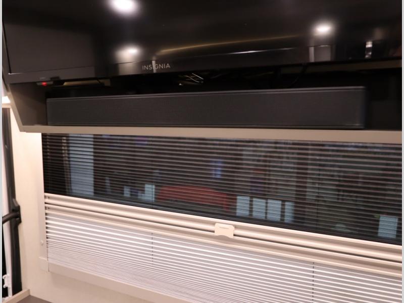 The 24T floorplan offers a luxurious home theater setup that transforms to a maintenance free powered walkaround queen murphy bed that can be used with the slide room in or out, with an enormous rear gear garage for exterior and basement storage. A strong solid foundation with standard automatic hydraulic leveling!