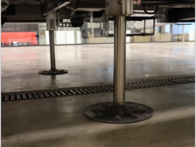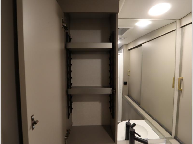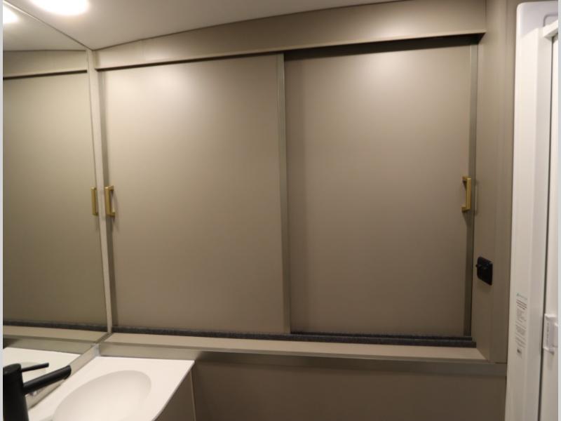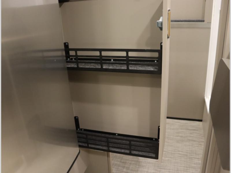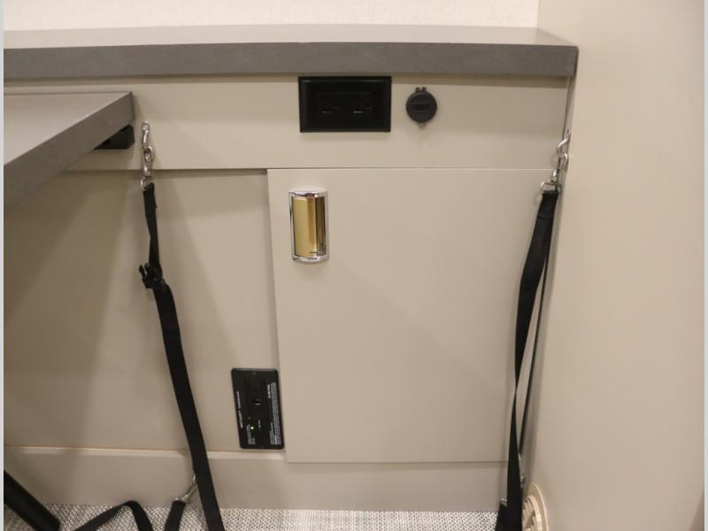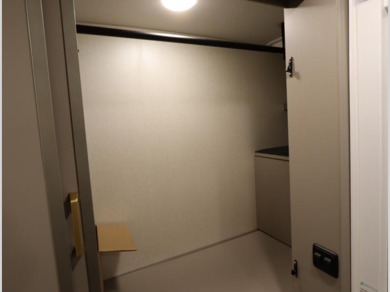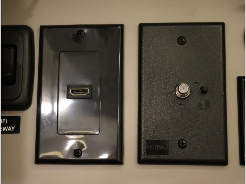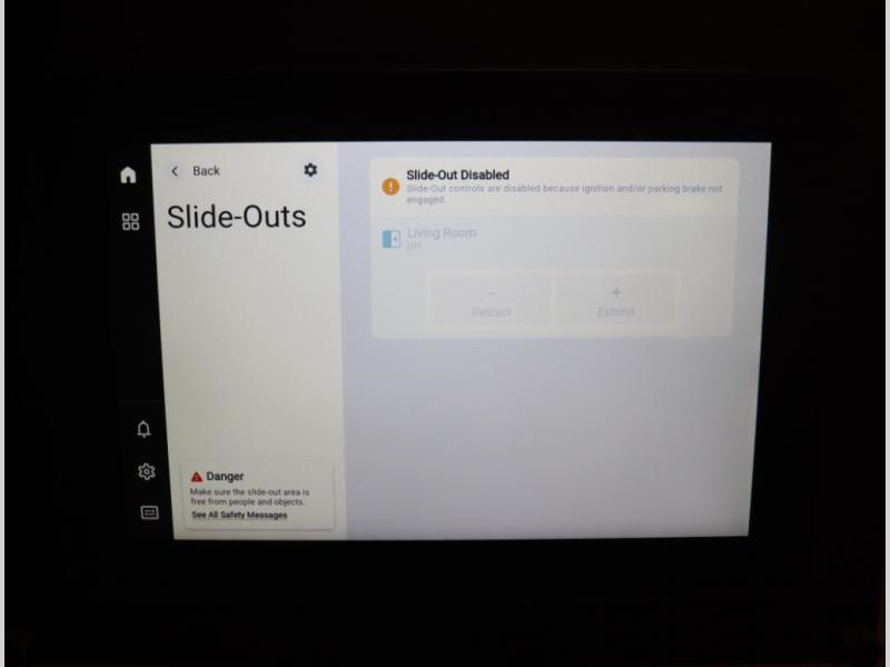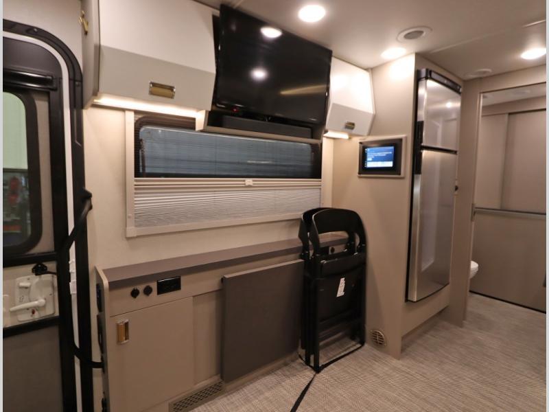 The 24T floorplan offers a luxurious home theater setup that transforms to a maintenance free powered walkaround queen murphy bed that can be used with the slide room in or out, with an enormous rear gear garage for exterior and basement storage. A strong solid foundation with standard automatic hydraulic leveling!