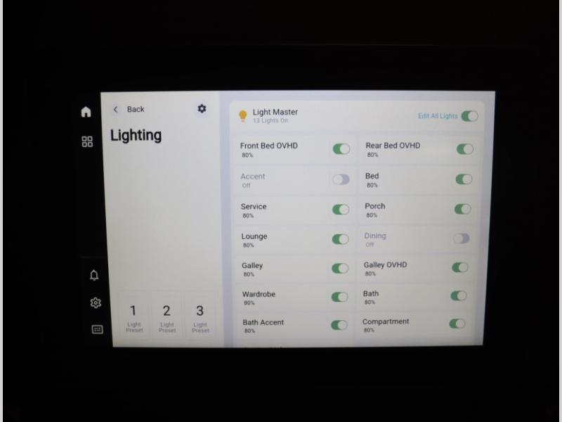 8. 320 ah Lithionics UL 1973 certified lithium battery, expandable and replenished with dual 120 watt, 240 watts total yet expandable if needed, solar, while the coach is in transit or when using shore line power or the generator
