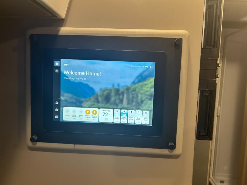 The Winnebago View 24T Class C diesel motorhome is functional, innovative, and stylish! You can rule the interstate with the Mercedes-Benz RWD Sprinter chassis, or choose the optional Mercedes-Benz AWD Sprinter chassis to tackle tougher terrain. A Lithium Power Package comes with a 320-amp-hour lithium battery and a dedicated second alternator that will allow you to charge the batteries faster while you're on the road. There are also two 120-watt solar panels to keep you going when you're off-grid. Since there is a heated gear garage with L-track cargo tie-downs, you can bring along two full-size bikes and additional gear for hiking, plus there are 110V/12V charging ports and LED lighting here for added convenience. The contemporary interior features blackout roller shades for the lounge and dining area, woven vinyl flooring throughout, and dimmable LED lighting. There is also a Winnebago Connect that is integrated into your Winnebago app that acts as your RV companion. Now you can stay informed on vehicle system alerts, travel prep resources, energy management, and more!