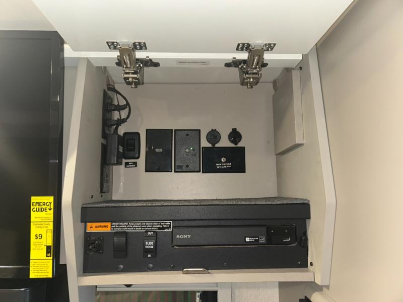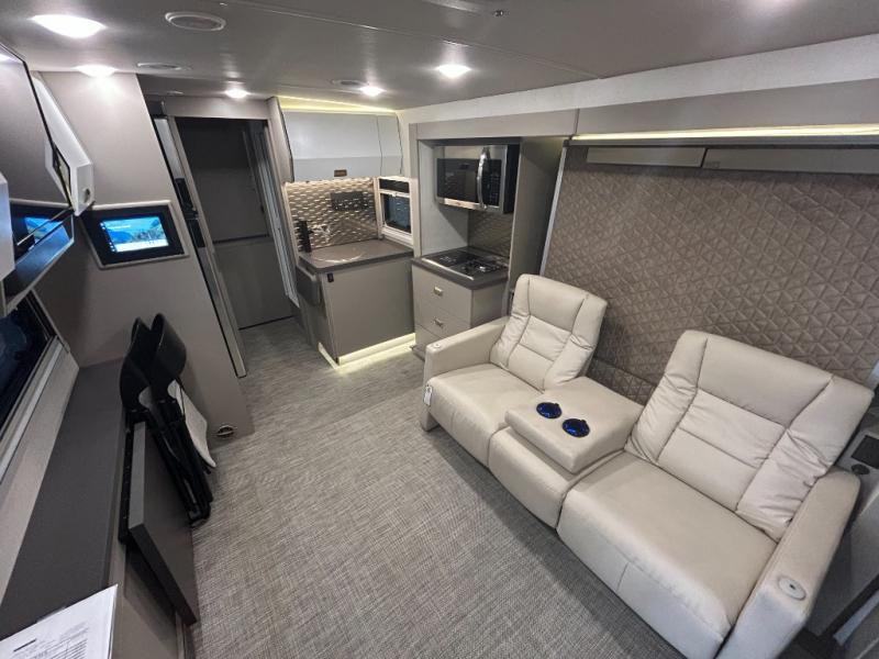 The perfect couples coach or for a family of three or four! You will be able to easily set up the queen Murphy+ bed when it's time for bedtime while the kids or your guests sleep on the 49" x 75" cabover bunk. You can also choose the optional low profile front cap with storage if you do not need the added sleeping space. An optional 3800W RVMP Flex Power generator is also available with this model. Everyone can get cleaned up in the full bathroom that has a space-saving sliding door and large wardrobe along the very rear that features a gear garage below. Create yummy meals and snacks using the kitchen appliances and the flip-up counter, then dine at the fold-down table with chairs, or eat seated on the theater seating with lap tables nearby on either side.