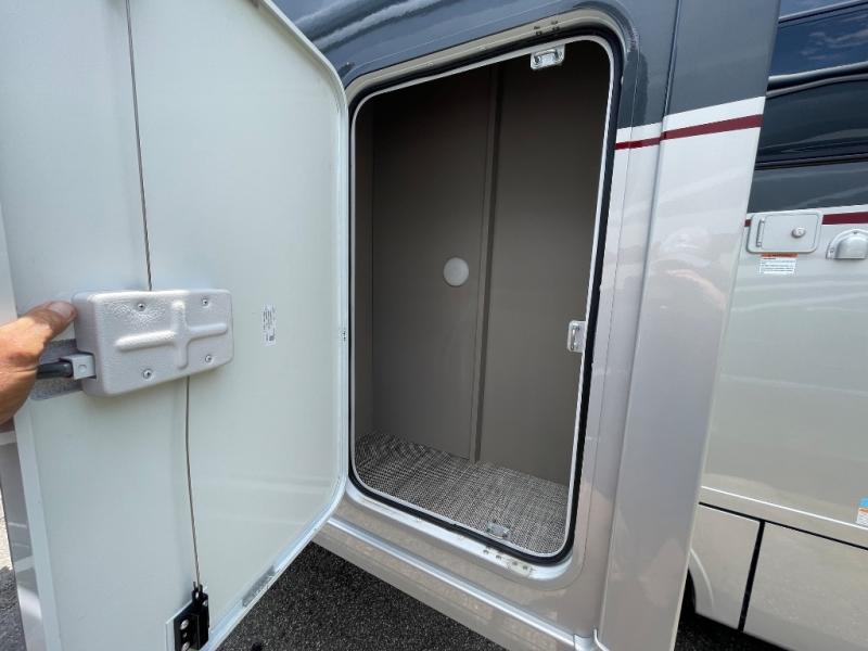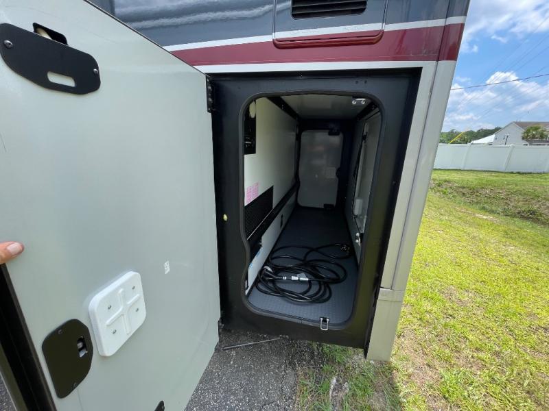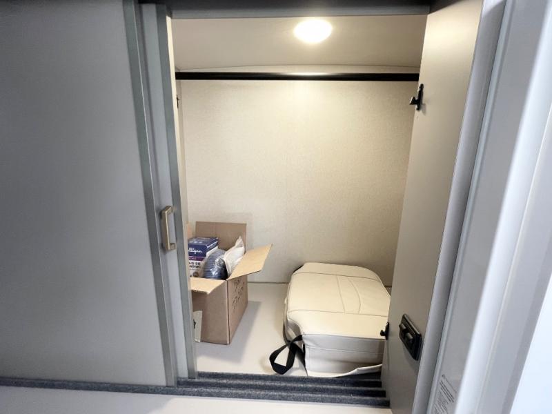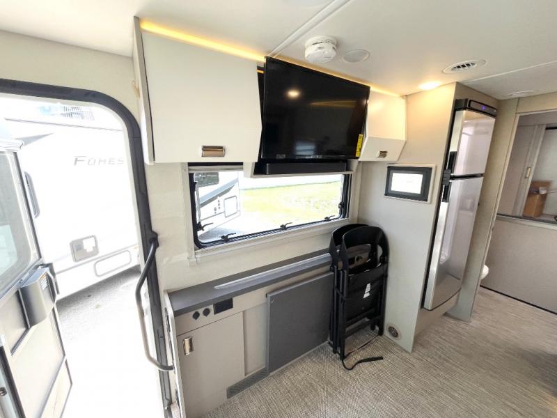 The perfect couples coach or for a family of three or four! This versatile Murphy bed unit will offer you sleeping space when you need it, then a comfortable living area during the day with plenty of seating all while keeping your same coach length. You will be able to easily set up the queen Murphy+ bed when it's time for bedtime while the kids or your guests sleep on the 49" x 75" cabover bunk. You can also choose the optional low profile front cap with storage if you do not need the added sleeping space. Everyone can get cleaned up in the full bathroom that has a space-saving sliding door and large wardrobe along the very rear that features a gear garage below. Create yummy meals and snacks using the kitchen appliances and the flip-up counter, then dine at the fold-down table with chairs, or eat seated on the theater seating with lap tables nearby on either side.
