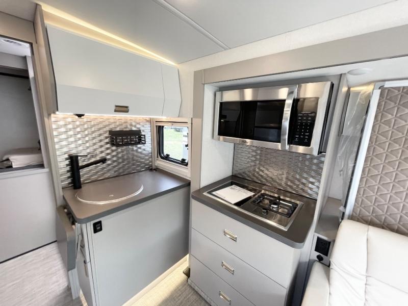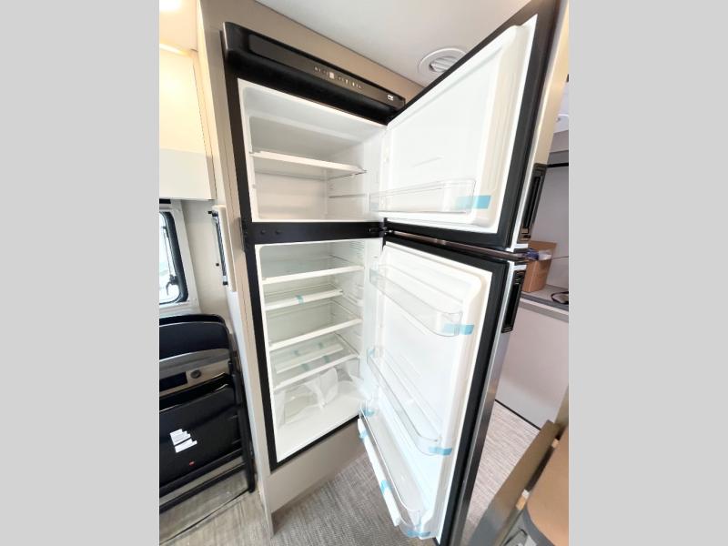 The Winnebago View 24T Class C diesel motorhome is functional, innovative, and stylish! You can rule the interstate with the Mercedes-Benz RWD Sprinter chassis, or choose the optional Mercedes-Benz AWD Sprinter chassis to tackle tougher terrain. A Lithium Power Package comes with a 320-amp-hour lithium battery and a dedicated second alternator that will allow you to charge the batteries faster while you're on the road. There are also two 120-watt solar panels to keep you going when you're off-grid. Since there is a heated gear garage with L-track cargo tie-downs, you can bring along two full-size bikes and additional gear for hiking, plus there are 110V/12V charging ports and LED lighting here for added convenience. The contemporary interior features blackout roller shades for the lounge and dining area, woven vinyl flooring throughout, and dimmable LED lighting. There is also a Winnebago Connect that is integrated into your Winnebago app that acts as your RV companion. Now you can stay informed on vehicle system alerts, travel prep resources, energy management, and more!