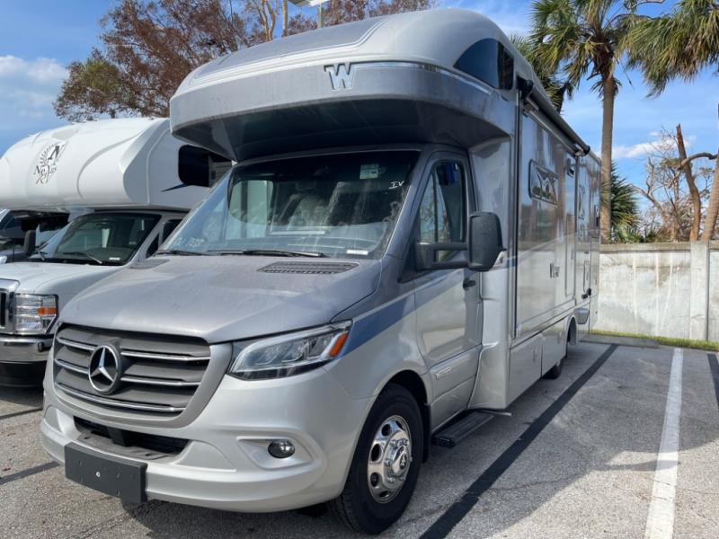 The Winnebago View 24T Class C diesel motorhome is functional, innovative, and stylish! You can rule the interstate with the Mercedes-Benz RWD Sprinter chassis, or choose the optional Mercedes-Benz AWD Sprinter chassis to tackle tougher terrain. A Lithium Power Package comes with a 320-amp-hour lithium battery and a dedicated second alternator that will allow you to charge the batteries faster while you're on the road. There are also two 120-watt solar panels to keep you going when you're off-grid. Since there is a heated gear garage with L-track cargo tie-downs, you can bring along two full-size bikes and additional gear for hiking, plus there are 110V/12V charging ports and LED lighting here for added convenience. The contemporary interior features blackout roller shades for the lounge and dining area, woven vinyl flooring throughout, and dimmable LED lighting. There is also a Winnebago Connect that is integrated into your Winnebago app that acts as your RV companion. Now you can stay informed on vehicle system alerts, travel prep resources, energy management, and more!