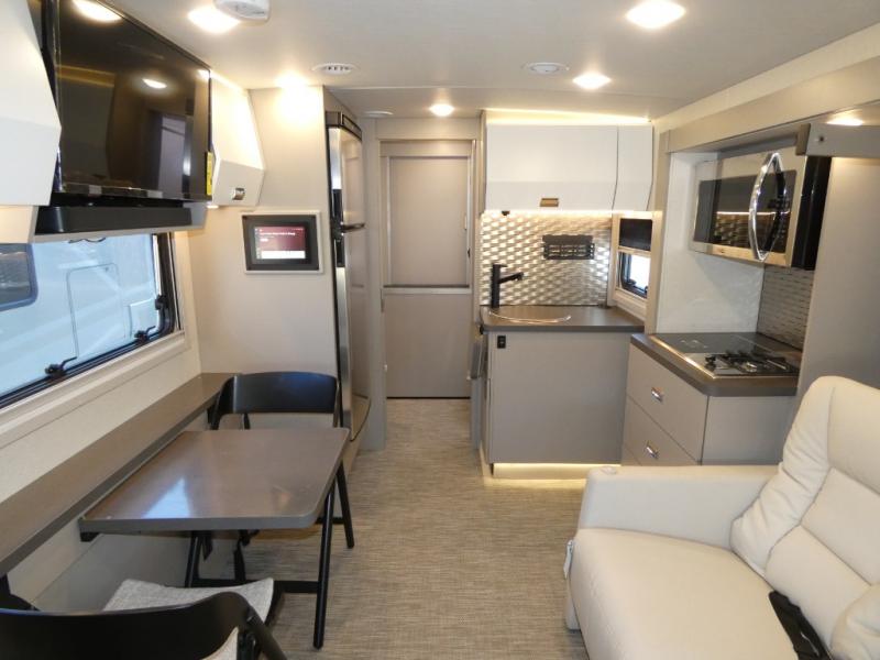 The perfect couples coach or for a family of three or four! You will be able to easily set up the queen Murphy+ bed when it's time for bedtime while the kids or your guests sleep on the 49" x 75" cabover bunk. Everyone can get cleaned up in the full bathroom that has a space-saving sliding door and large wardrobe along the very rear that features a gear garage below. Create yummy meals and snacks using the kitchen appliances and the flip-up counter, then dine at the fold-down table with chairs, or eat seated on the theater seating with lap tables nearby on either side.