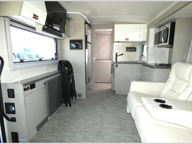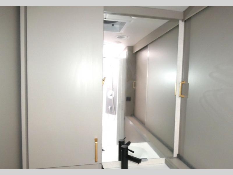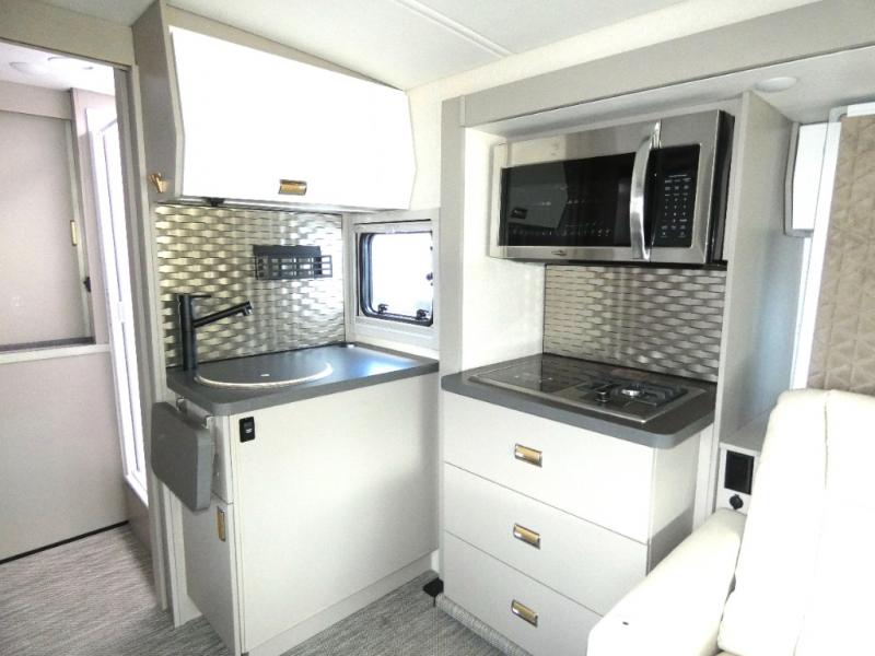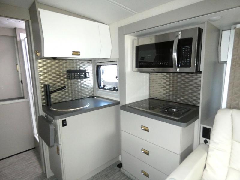 The perfect couples coach or for a family of three or four! You will be able to easily set up the queen Murphy+ bed when it's time for bedtime while the kids or your guests sleep on the 49" x 75" cabover bunk. Everyone can get cleaned up in the full bathroom that has a space-saving sliding door and large wardrobe along the very rear that features a gear garage below. Create yummy meals and snacks using the kitchen appliances and the flip-up counter, then dine at the fold-down table with chairs, or eat seated on the theater seating with lap tables nearby on either side.
