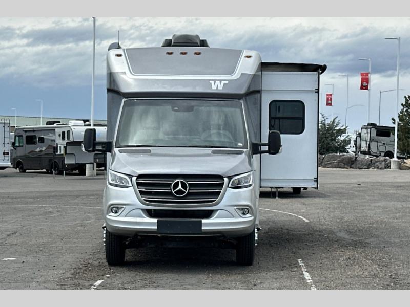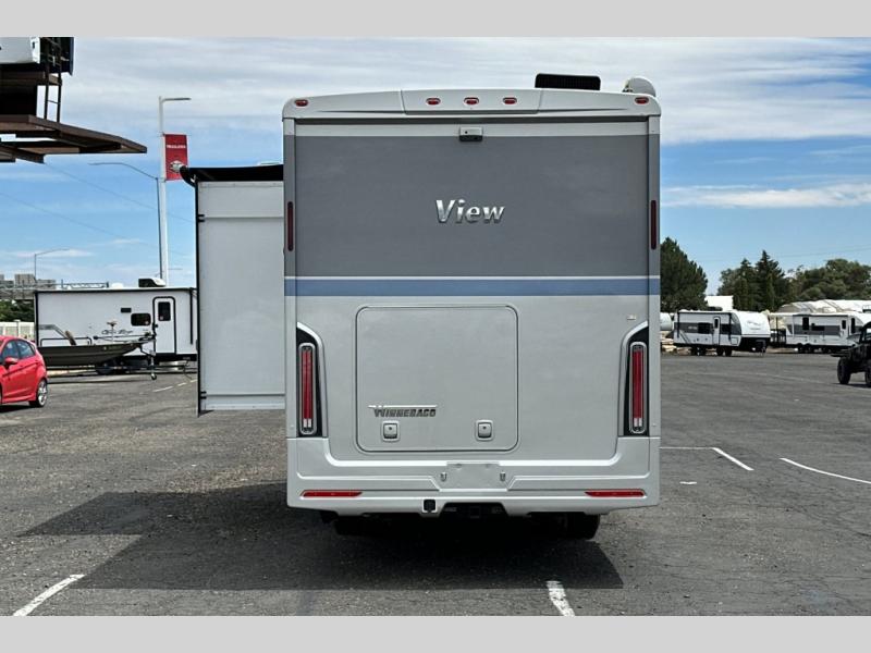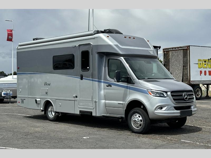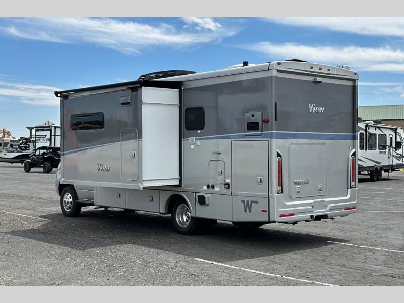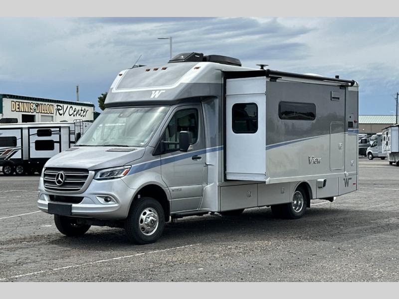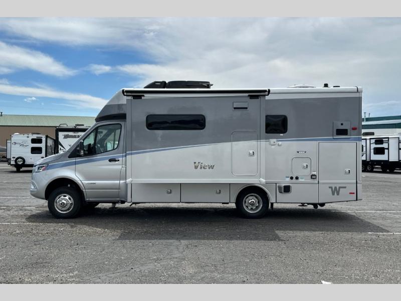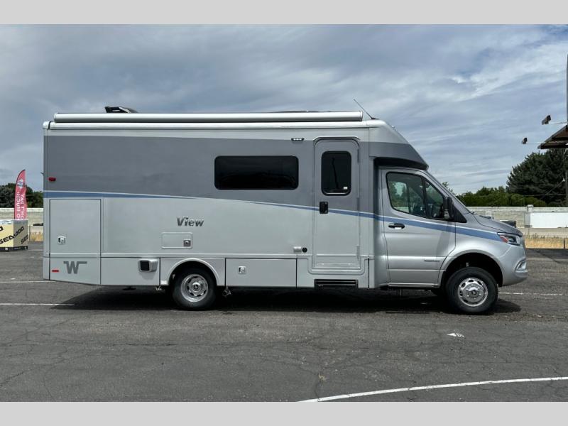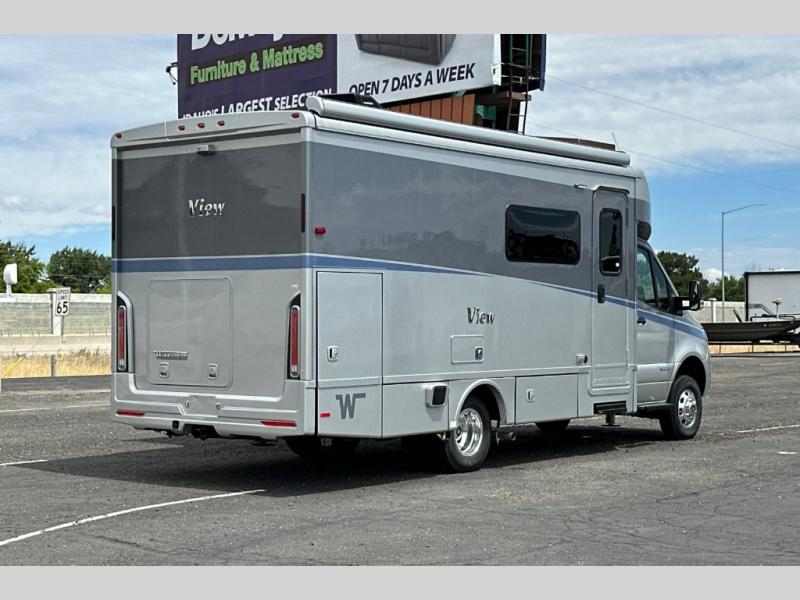 The Winnebago View 24T Class C diesel motorhome is functional, innovative, and stylish! You can rule the interstate with the Mercedes-Benz RWD Sprinter chassis, or choose the optional Mercedes-Benz AWD Sprinter chassis to tackle tougher terrain. A Lithium Power Package comes with a 320-amp-hour lithium battery and a dedicated second alternator that will allow you to charge the batteries faster while you're on the road. There are also two 120-watt solar panels to keep you going when you're off-grid. Since there is a heated gear garage with L-track cargo tie-downs, you can bring along two full-size bikes and additional gear for hiking, plus there are 110V/12V charging ports and LED lighting here for added convenience. The contemporary interior features blackout roller shades for the lounge and dining area, woven vinyl flooring throughout, and dimmable LED lighting. There is also a Winnebago Connect that is integrated into your Winnebago app that acts as your RV companion. Now you can stay informed on vehicle system alerts, travel prep resources, energy management, and more!