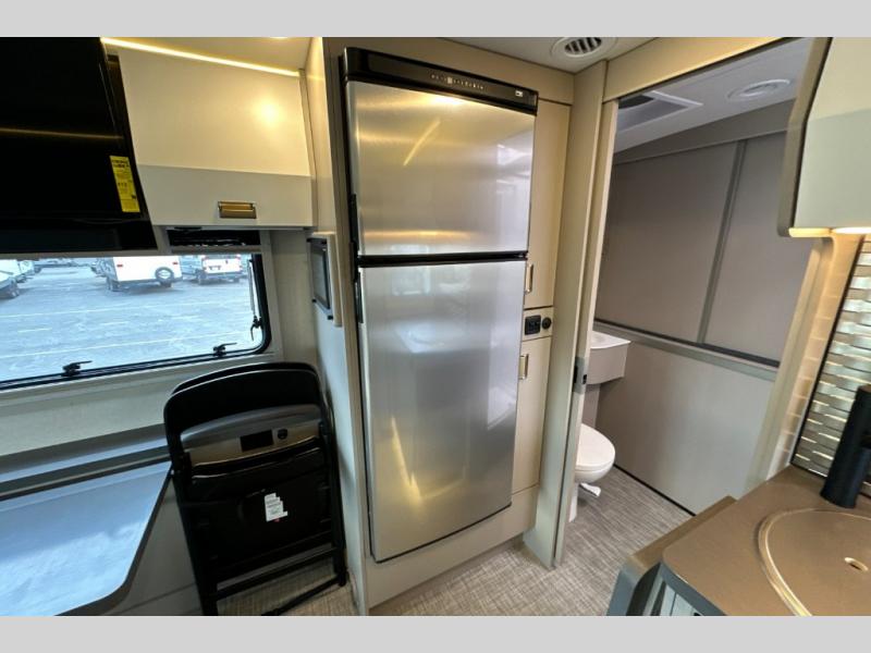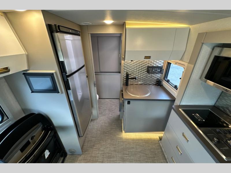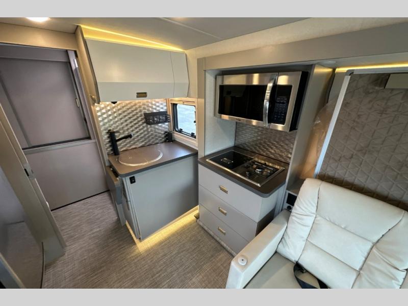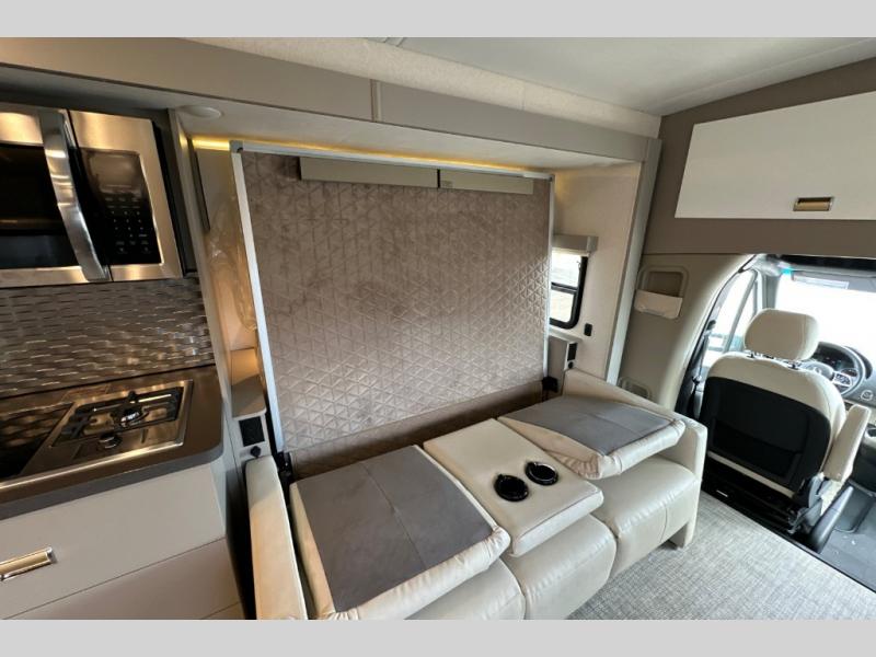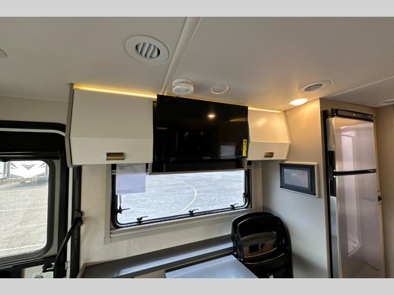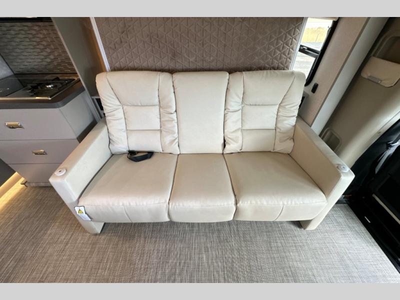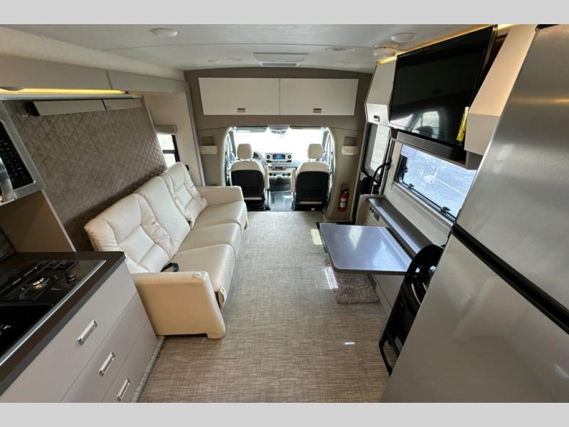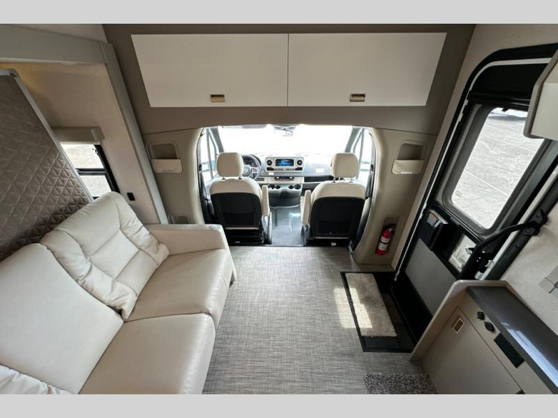 The Winnebago View 24T Class C diesel motorhome is functional, innovative, and stylish! You can rule the interstate with the Mercedes-Benz RWD Sprinter chassis, or choose the optional Mercedes-Benz AWD Sprinter chassis to tackle tougher terrain. A Lithium Power Package comes with a 320-amp-hour lithium battery and a dedicated second alternator that will allow you to charge the batteries faster while you're on the road. There are also two 120-watt solar panels to keep you going when you're off-grid. Since there is a heated gear garage with L-track cargo tie-downs, you can bring along two full-size bikes and additional gear for hiking, plus there are 110V/12V charging ports and LED lighting here for added convenience. The contemporary interior features blackout roller shades for the lounge and dining area, woven vinyl flooring throughout, and dimmable LED lighting. There is also a Winnebago Connect that is integrated into your Winnebago app that acts as your RV companion. Now you can stay informed on vehicle system alerts, travel prep resources, energy management, and more!