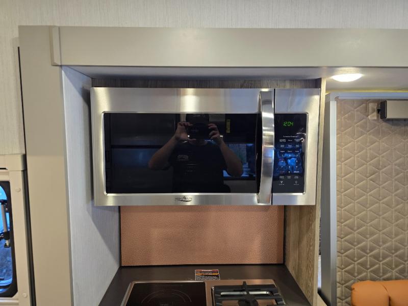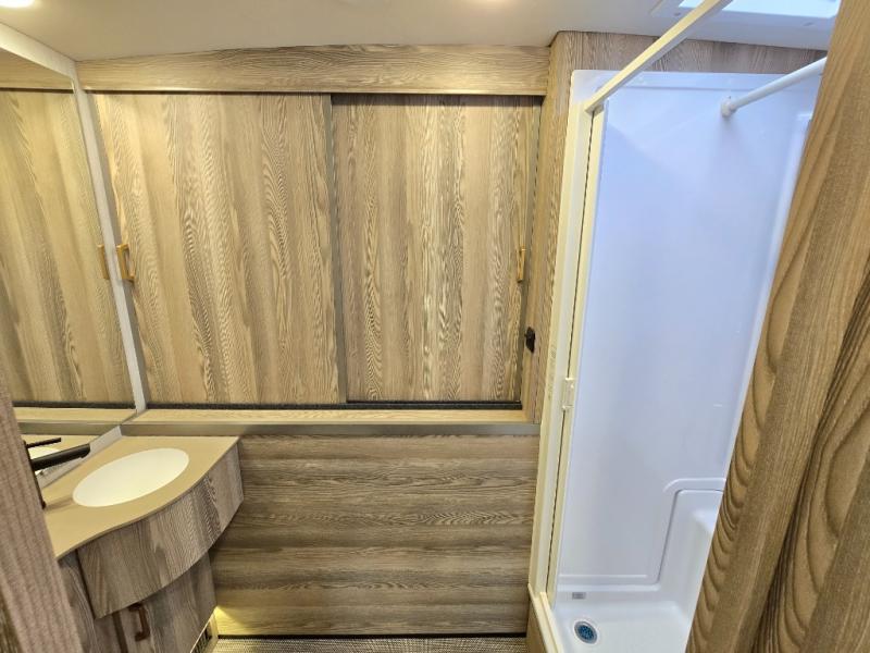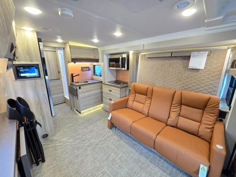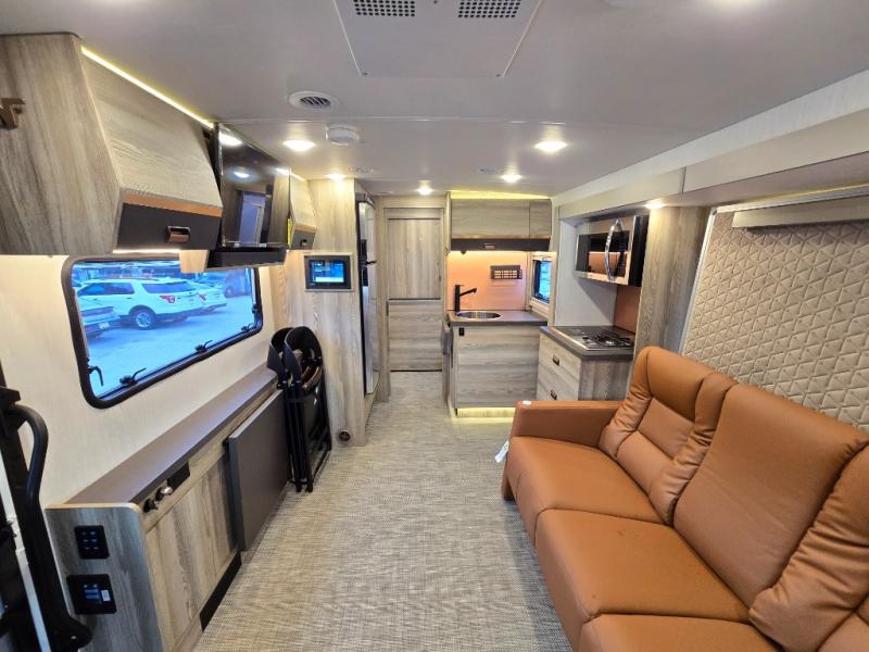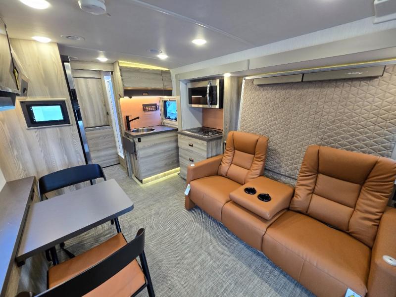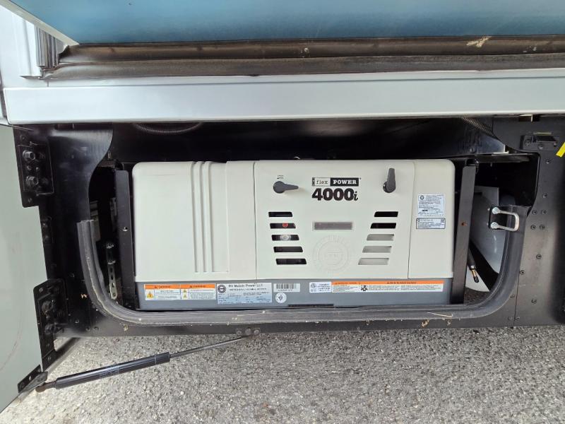 The perfect couples coach or for a family of three or four! You will be able to easily set up the queen Murphy+ bed when it's time for bedtime while the kids or your guests sleep on the 49" x 75" cabover bunk. You can also choose the optional low profile front cap with storage if you do not need the added sleeping space. An optional 3800W RVMP Flex Power generator is also available with this model. Everyone can get cleaned up in the full bathroom that has a space-saving sliding door and large wardrobe along the very rear that features a gear garage below. Create yummy meals and snacks using the kitchen appliances and the flip-up counter, then dine at the fold-down table with chairs, or eat seated on the theater seating with lap tables nearby on either side.