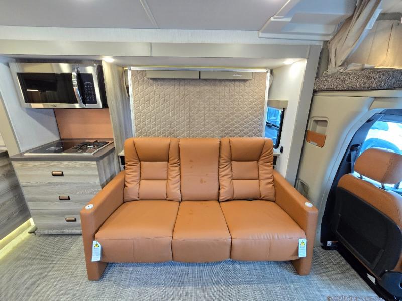 The Winnebago View 24T Class C diesel motorhome is functional, innovative, and stylish! You can rule the interstate with the Mercedes-Benz RWD Sprinter chassis, or choose the optional Mercedes-Benz AWD Sprinter chassis to tackle tougher terrain. A Lithium Power Package comes with a 320-amp-hour lithium battery and a dedicated second alternator that will allow you to charge the batteries faster while you're on the road. There are also two 120-watt solar panels to keep you going when you're off-grid. Since there is a heated gear garage with L-track cargo tie-downs, you can bring along two full-size bikes and additional gear for hiking, plus there are 110V/12V charging ports and LED lighting here for added convenience. The contemporary interior features blackout roller shades for the lounge and dining area, woven vinyl flooring throughout, and dimmable LED lighting. There is also a Winnebago Connect that is integrated into your Winnebago app that acts as your RV companion. Now you can stay informed on vehicle system alerts, travel prep resources, energy management, and more!