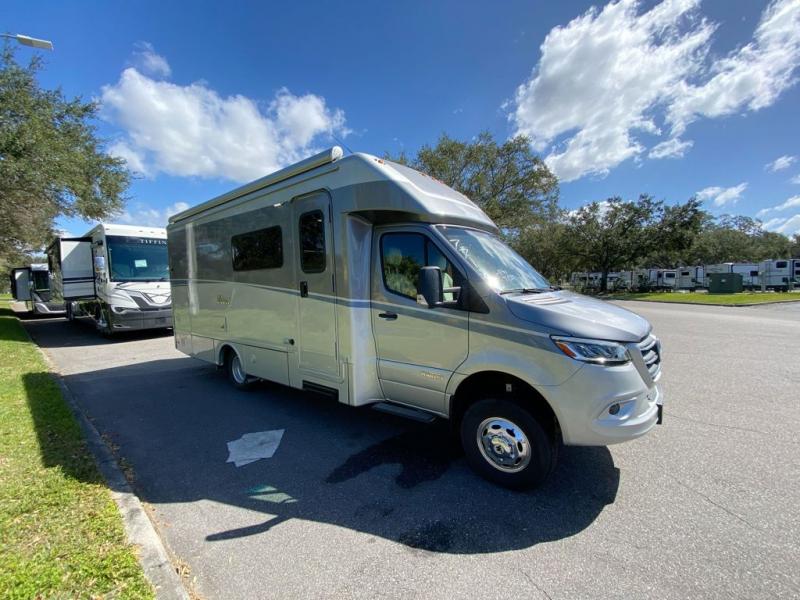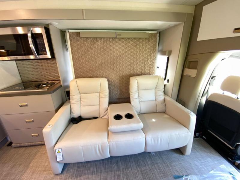The Winnebago View 24T Class C diesel motorhome is functional, innovative, and stylish! You can rule the interstate with the Mercedes-Benz RWD Sprinter chassis, or choose the optional Mercedes-Benz AWD Sprinter chassis to tackle tougher terrain. A Lithium Power Package comes with a 320-amp-hour lithium battery and a dedicated second alternator that will allow you to charge the batteries faster while you're on the road. There are also two 120-watt solar panels to keep you going when you're off-grid. Since there is a heated gear garage with L-track cargo tie-downs, you can bring along two full-size bikes and additional gear for hiking, plus there are 110V/12V charging ports and LED lighting here for added convenience. The contemporary interior features blackout roller shades for the lounge and dining area, woven vinyl flooring throughout, and dimmable LED lighting. There is also a Winnebago Connect that is integrated into your Winnebago app that acts as your RV companion. Now you can stay informed on vehicle system alerts, travel prep resources, energy management, and more!
