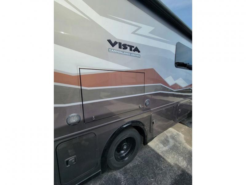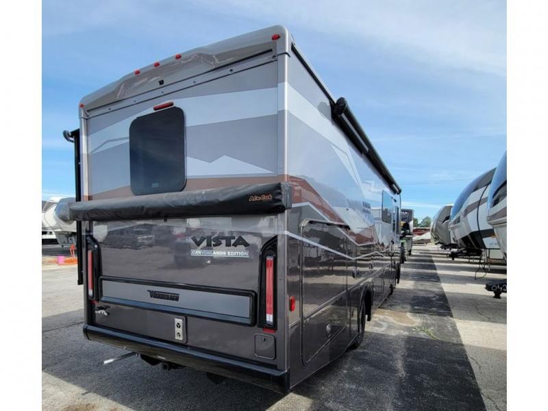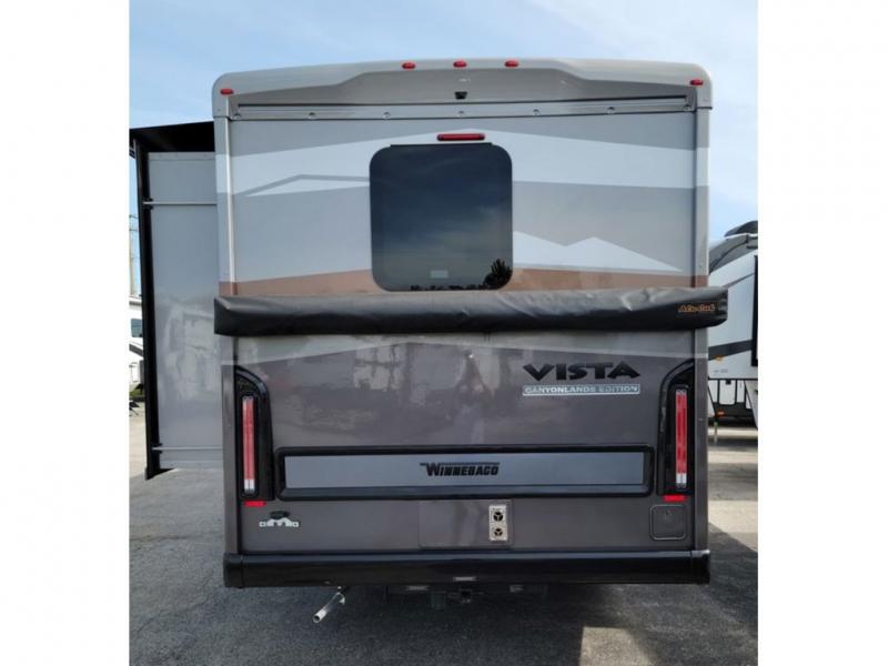 The Winnebago Vista National Park Foundation Limited Edition Class A gas motorhome is designed to fit almost any campsite! You can go off the grid with the upgraded solar energy system which has a standard 320 amp hour lithium-ion battery, a charge controller, and three solar panels for three times the unplugged power. The Batwing awning overlaps the standard armless patio awning for two sides of seamless wraparound protection to enhance your outdoor living. Speaking of enhanced outdoor living, the exterior kitchen included in the Tailgate package comes with a refrigerator, a sink, and a quick connect LP hose for a portable stove or grill, plus more convenient accessories. The outdoors are brought inside through the frameless tinted windows and the beautiful Salinas oak cabinets. Come check it out today!