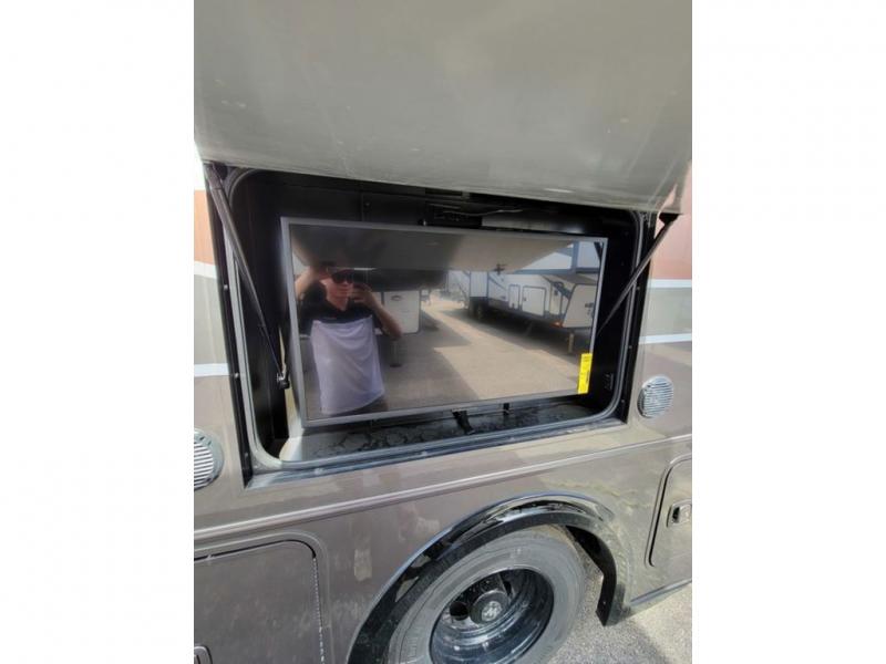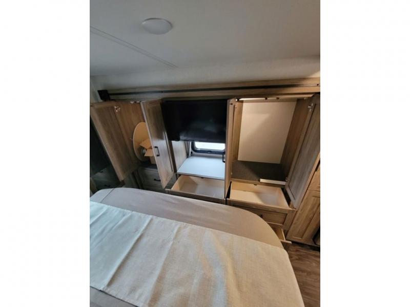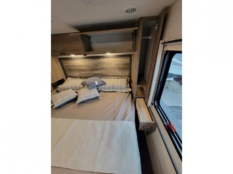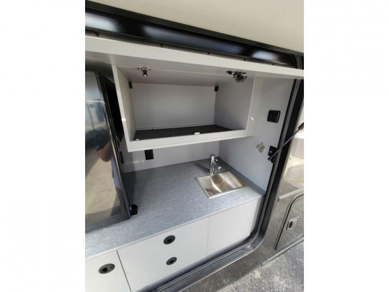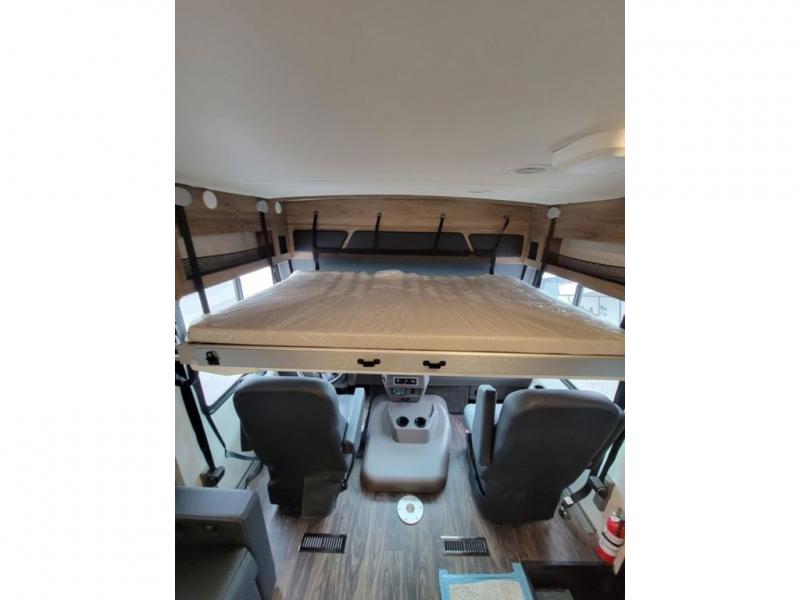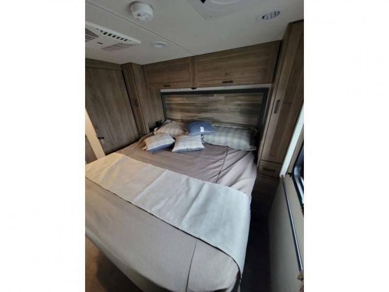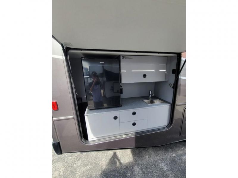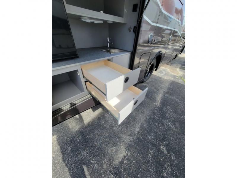 Head to your favorite destinations with this motorhome! You can travel with your spouse or bring an extra guest or two when you add the optional StudioLoft 50" x 80" powered bed above the cab. The 40" x 66" sofa bed can also transform into an extra sleeping space but if you don't need it then you can switch it out for the optional theater seating. Enjoy delicious home cooked meals while on the road with the three burner cooktop or head to the exterior kitchen to breathe in some fresh air while you cook. Eat your meals at the 42" x 70" dinette with Hi-Lo table and freshen up each morning in the full bathroom featuring a 26" x 38" shower. The rear private bedroom has a 72" x 75" king bed to lay your head on at night and wardrobes on either side of a storage area with a location for an optional TV to be added!