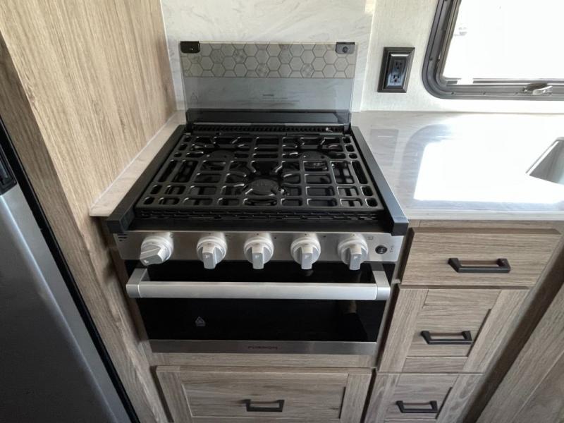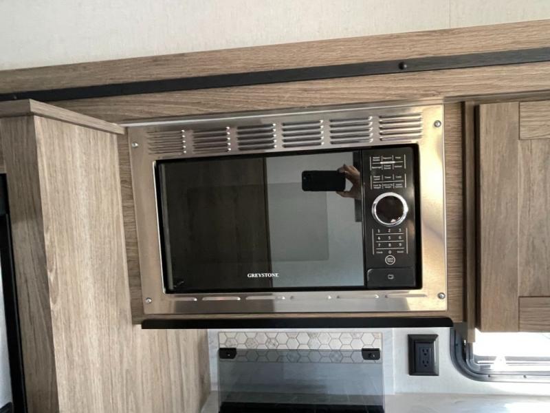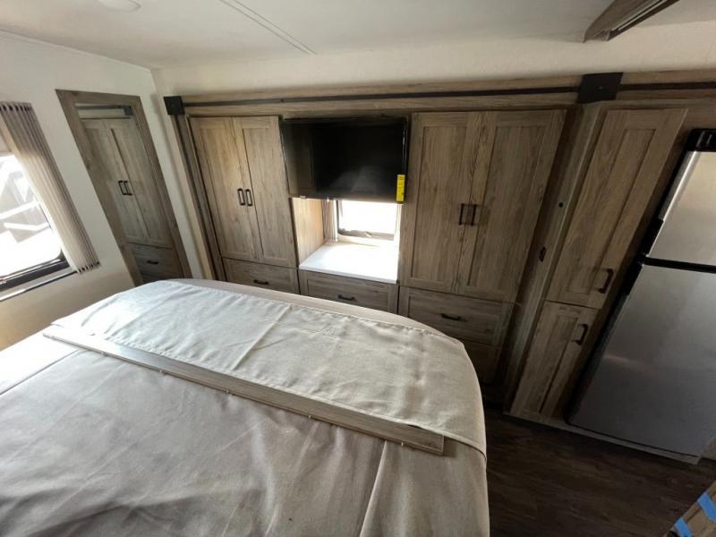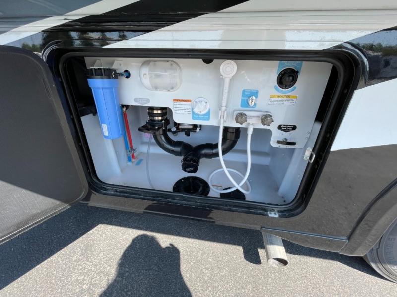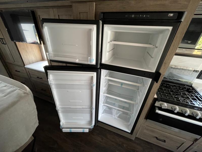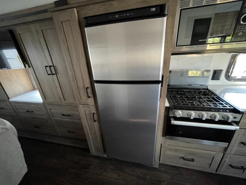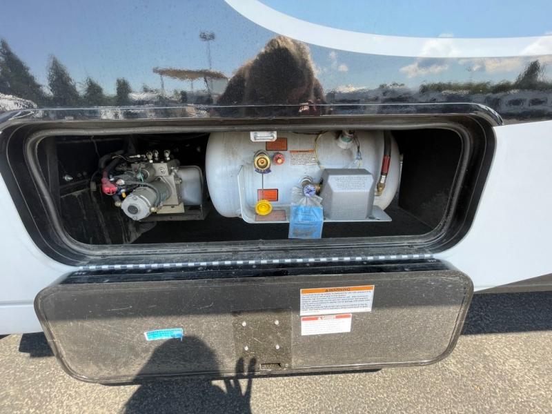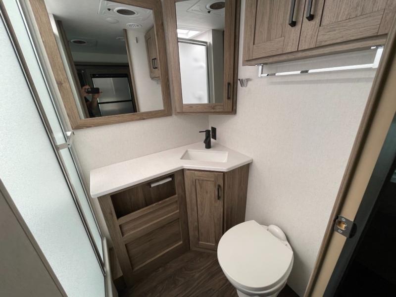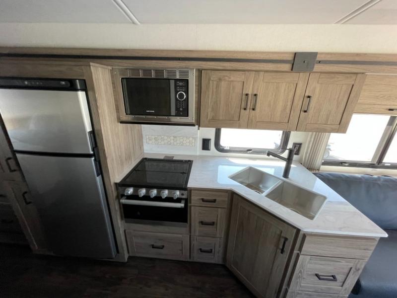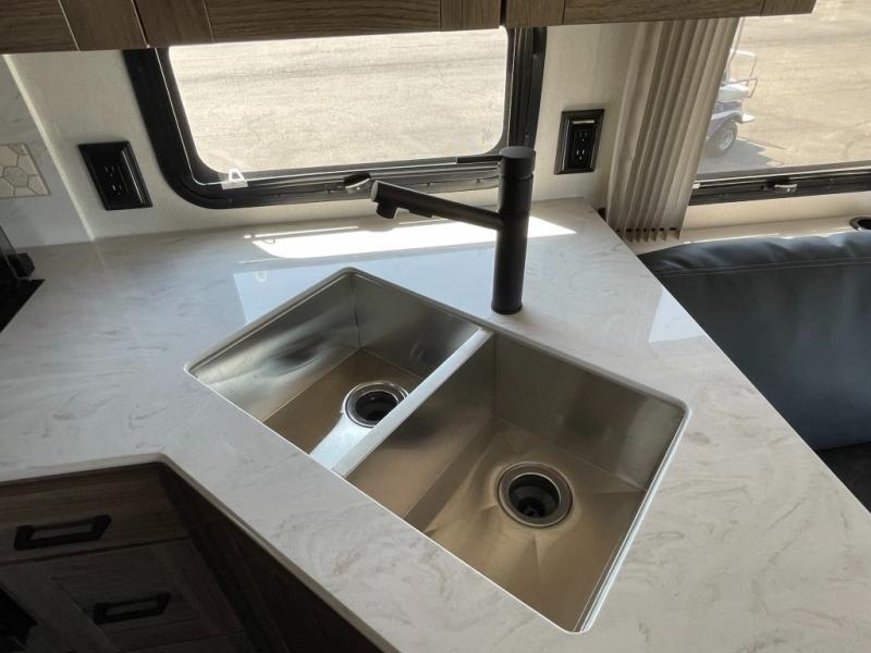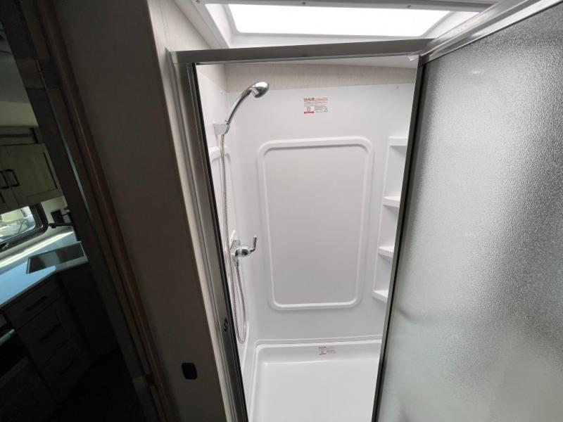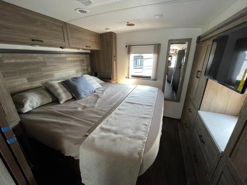 This motorhome will be your home away from home! It features a rear private bedroom with a 72" x 75" king bed across from one end of the full wall slide that spans the entire length of the unit. In the bedroom portion of the slide you will find two wardrobes with storage between and a space where you can add an optional TV. Start and end your days getting clean in the full bath including a 26" x 38" shower, large vanity with sink, and toilet. Cooking will be easy with the indoor and outdoor spaces. Inside, find a stainless steel 2-door 10 cu. ft. refrigerator for your perishables and a pantry for everyone's favorite snacks. The 42" x 70" dinette with Hi-Lo table comes with storage to keep your games close, and the 40" x 66" sofa bed can be switched out for optional theater seating to relax in true comfort while you watch your favorite movies if you like. You can also add an optional StudioLoft powered 50" x 80" bed above the swivel cab seats for added sleeping space for one or two more guests. This model also includes the Tailgate Package with LP quick-connect, a stainless steel sink, a paper towel holder, a refrigerator, plus more!