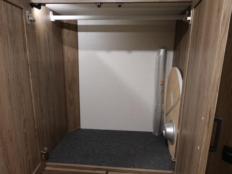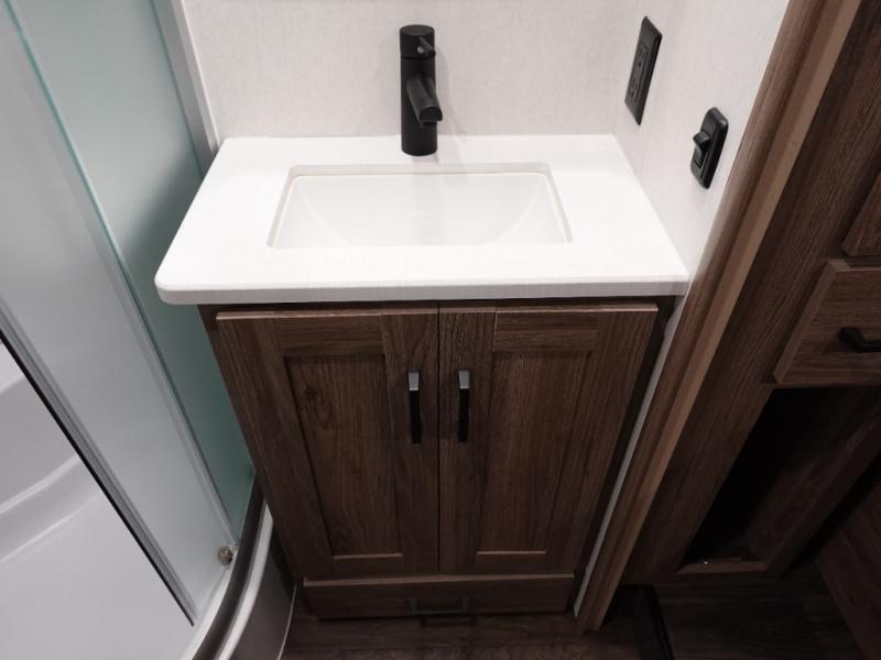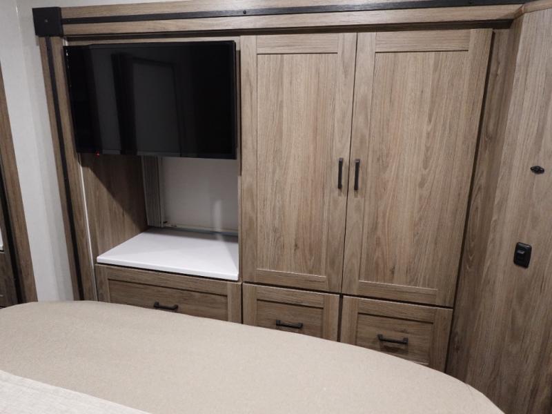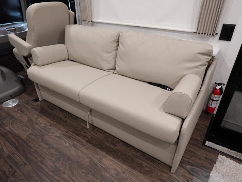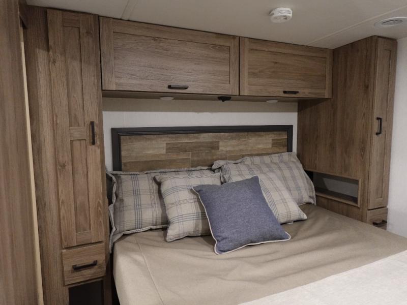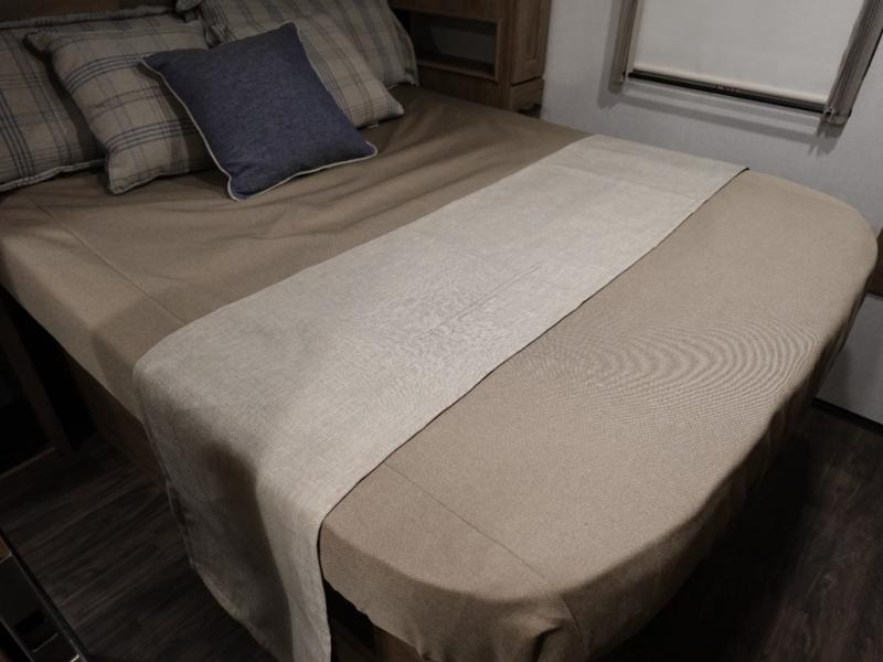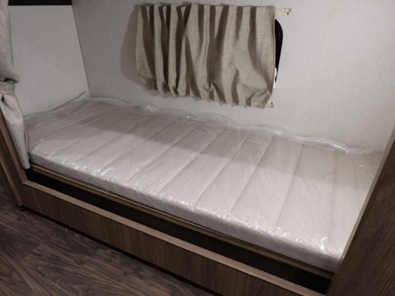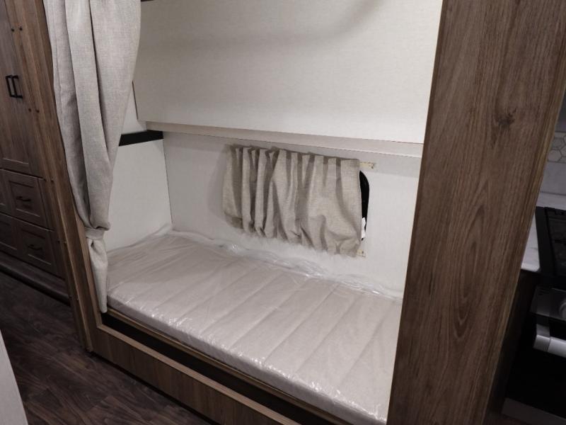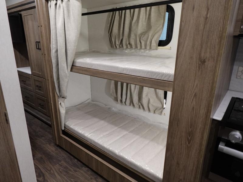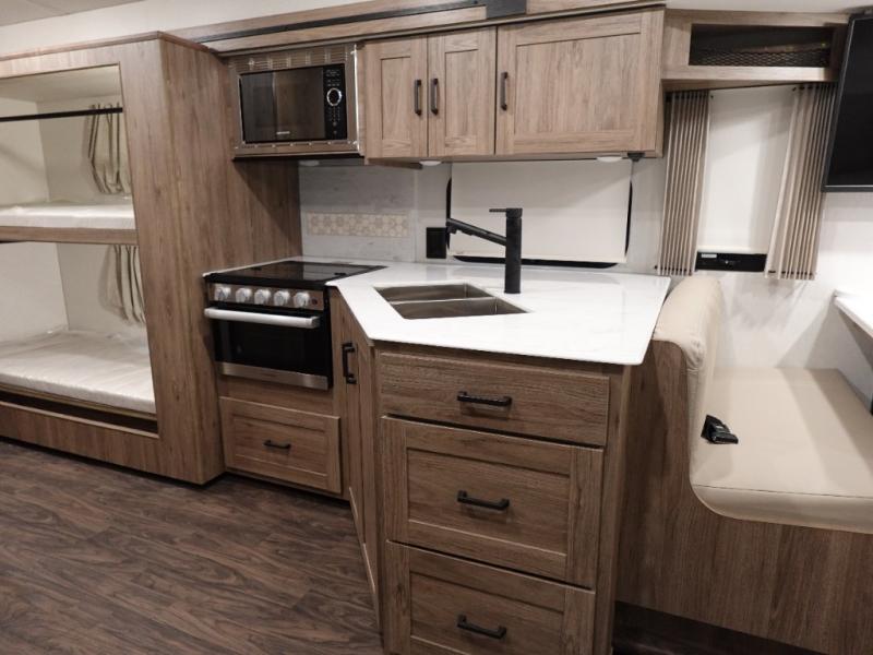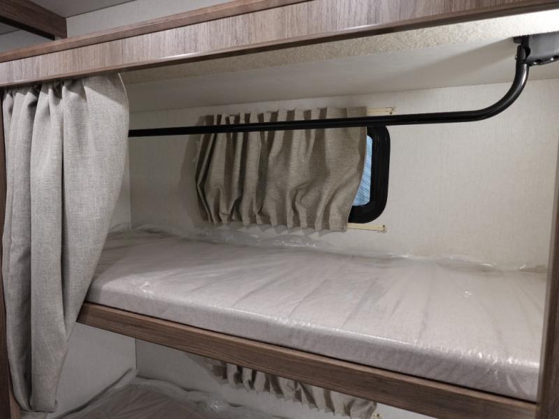 You will feel right at home in this motorhome! The rear private bedroom has a 60" x 75" queen bed with nightstands on either side, a wardrobe for your clothes, and an entrance into the dual entry bathroom. Across from the bathroom is a set of 30" x 73" bunk beds for the kids. The chef will have an easy time preparing delicious meals in the fully equipped kitchen, and they can be enjoyed at the 42" x 73" dinette with Hi-Lo table. The 40" x 66" sofa bed is not only great for relaxing while watching a movie on the 39" LCD HDTV, but also for transforming into an extra sleeping space. This model also includes the Tailgate Package with LP quick-connect, a stainless steel sink, a paper towel holder, a refrigerator, plus more!