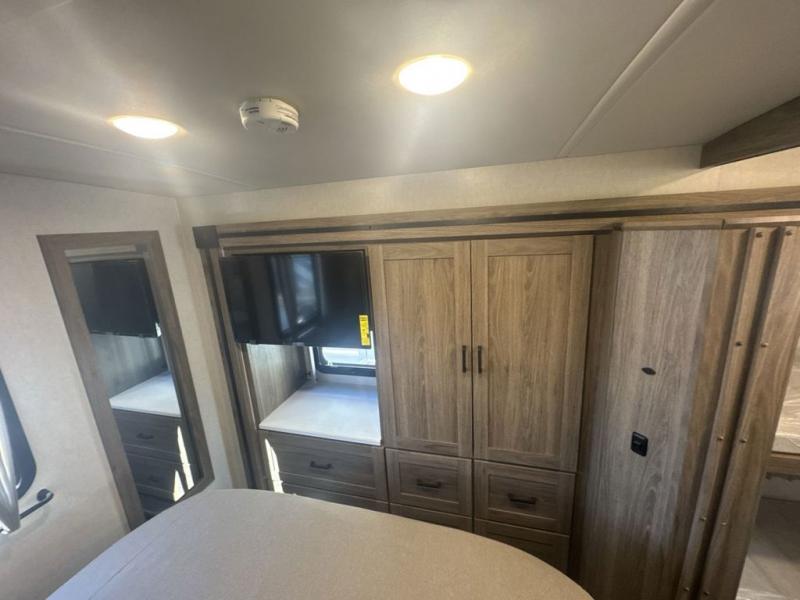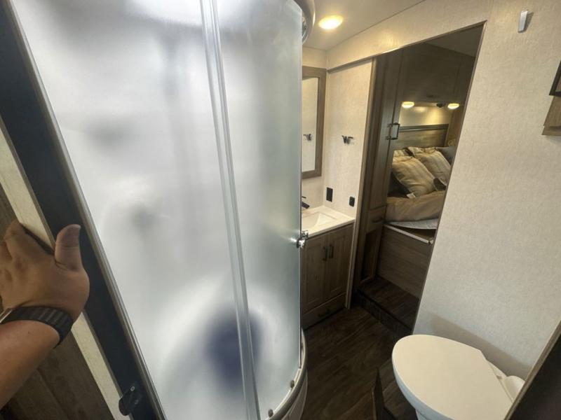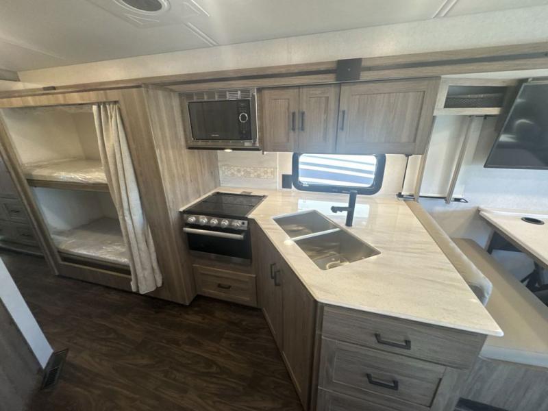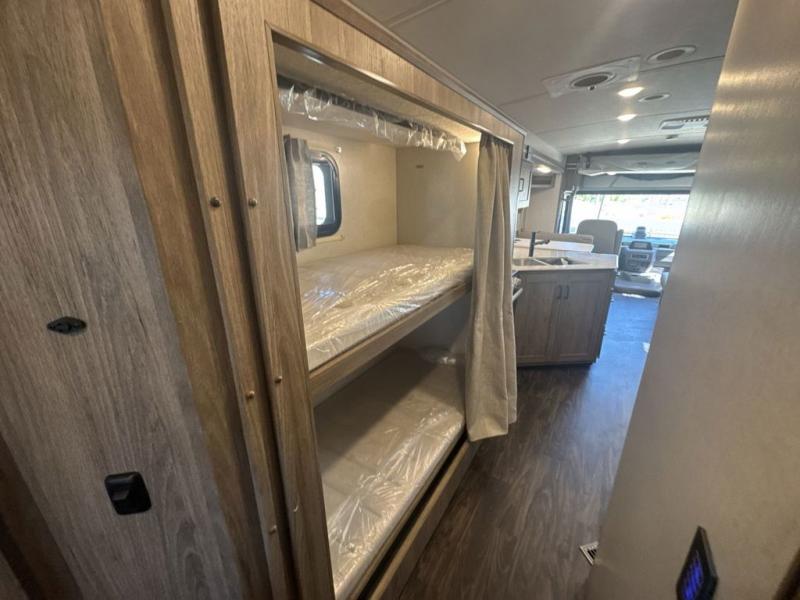 You will feel right at home in this motorhome! The rear private bedroom has a 60" x 75" queen bed with nightstands on either side, a wardrobe for your clothes, an area for an optional TV, and an entrance into the dual entry bathroom. Across from the bathroom is a set of 30" x 73" bunk beds for the kids. The chef will have an easy time preparing delicious meals in the fully equipped kitchen, and they can be enjoyed at the 42" x 73" dinette with Hi-Lo table. The 40" x 66" sofa bed is not only great for relaxing while watching a movie on the 39" LCD HDTV, but also for transforming into an extra sleeping space. If you need more sleeping space, you can also add the optional 50" x 80" powered StudioLoft bed above the cab. This model also includes the Tailgate Package with LP quick-connect, a stainless steel sink, a paper towel holder, a refrigerator, plus more!