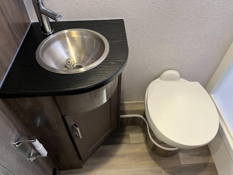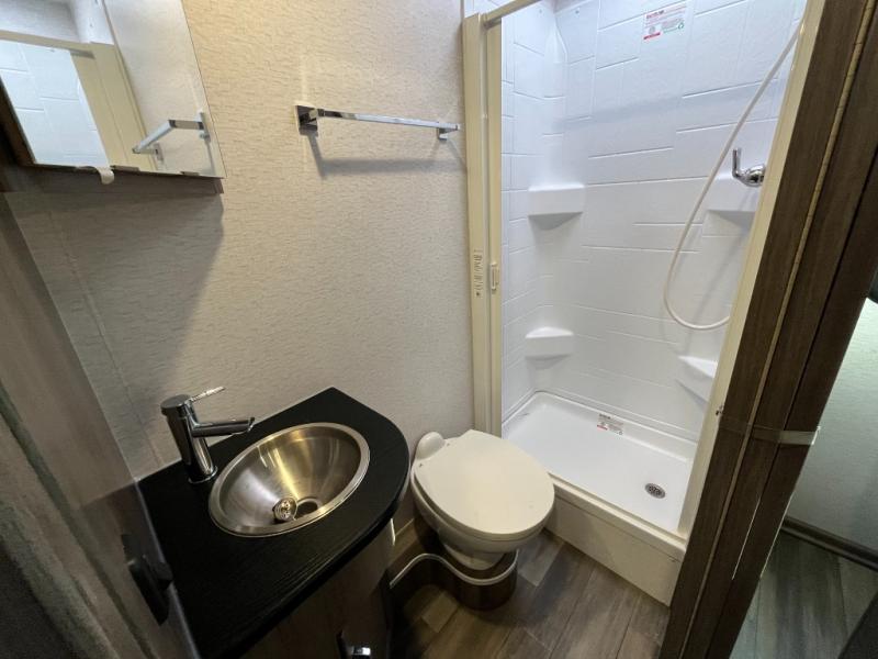 At the end of the day, the Vita 24P offers a serene bedroom area with a cozy bed and ample storage for your personal items. The full bathroom includes a shower, sink, and toilet — giving you all the comforts you need on the road without compromising convenience or space.