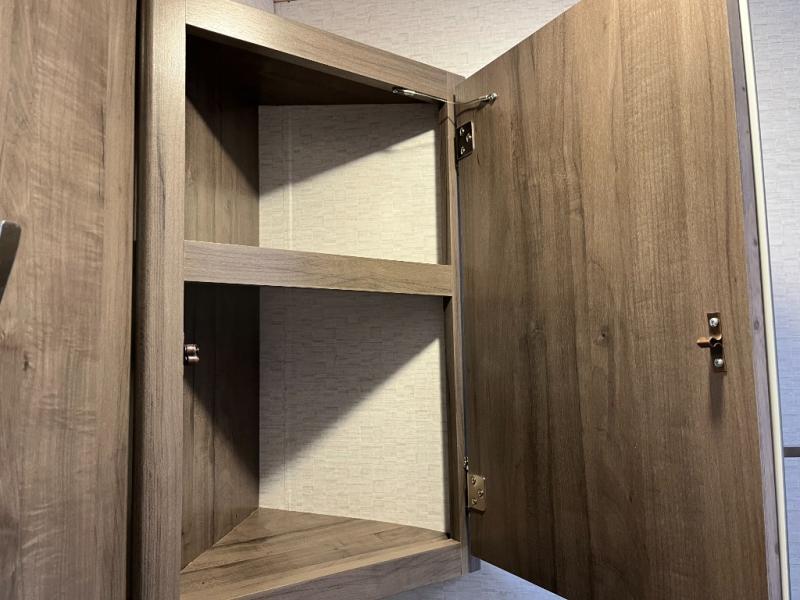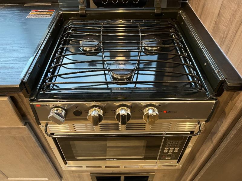 The fully functional kitchen is ready for everything from quick breakfasts to full dinners under the stars. Featuring a practical countertop workspace, efficient cooktop, microwave, refrigerator, and smart storage, this kitchen makes meal preparation simple and enjoyable no matter where you park for the night.