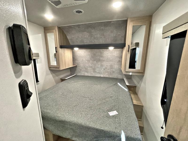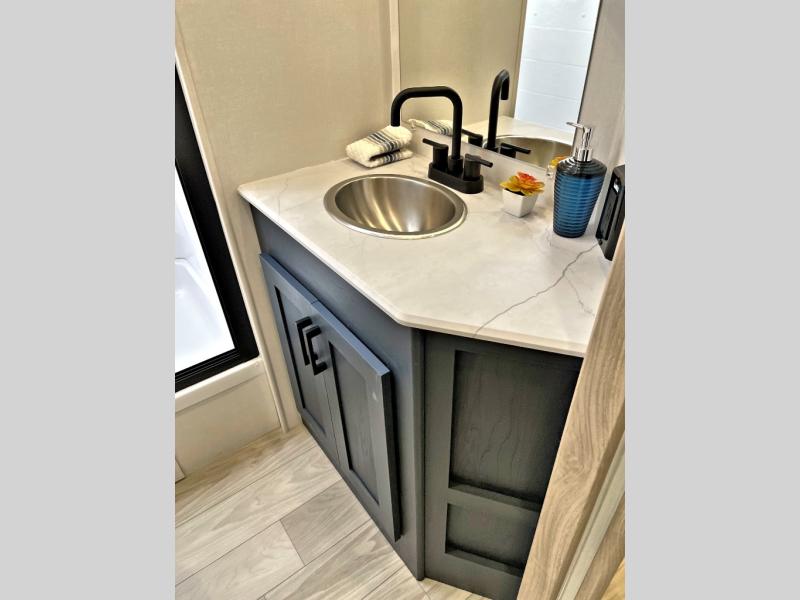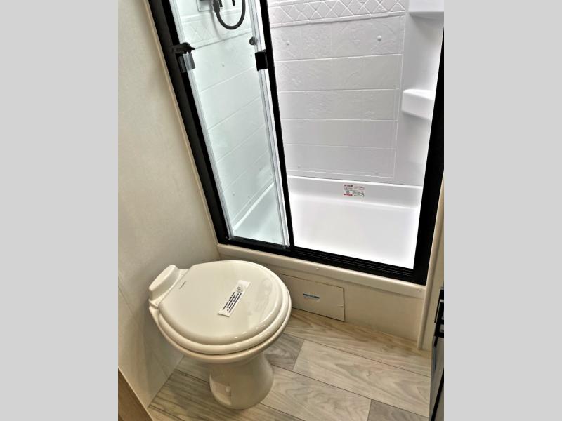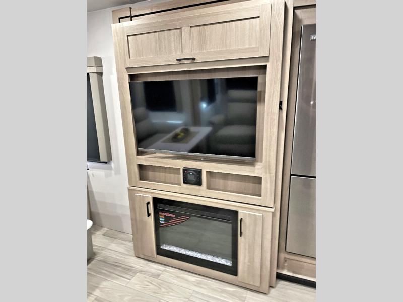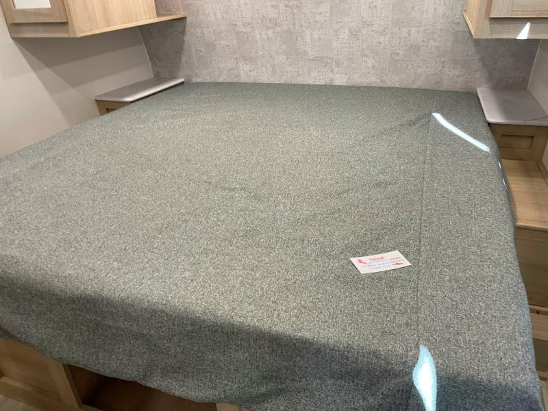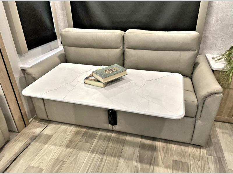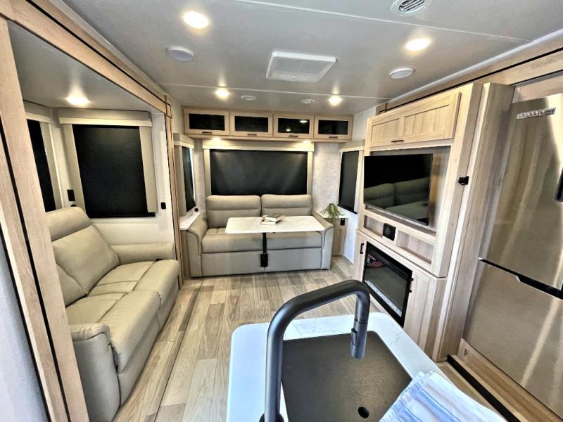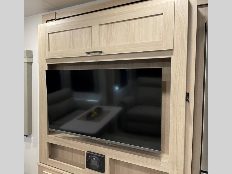 Looking to unwind indoors when you aren't hiking scenic trails? This trailer has extra gathering space in the rear living area because of the opposing slides that hold the theater seating on one side, and the hidden pantry behind the entertainment and the 15 cubic foot refrigerator on the other side. There is also a 72" tri-fold sofa in the rear with a sofa table so that you can easily keep your drinks nearby. As you get cleaned up in the full bathroom, you'll love that the large skylight brings in some extra natural lighting, and the front private bedroom will be a welcome retreat after a full day of camping. The dual bedside nightstands and wardrobes will allow you to keep things neat and tidy.