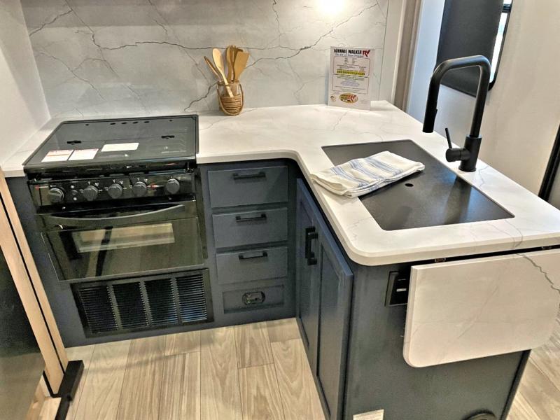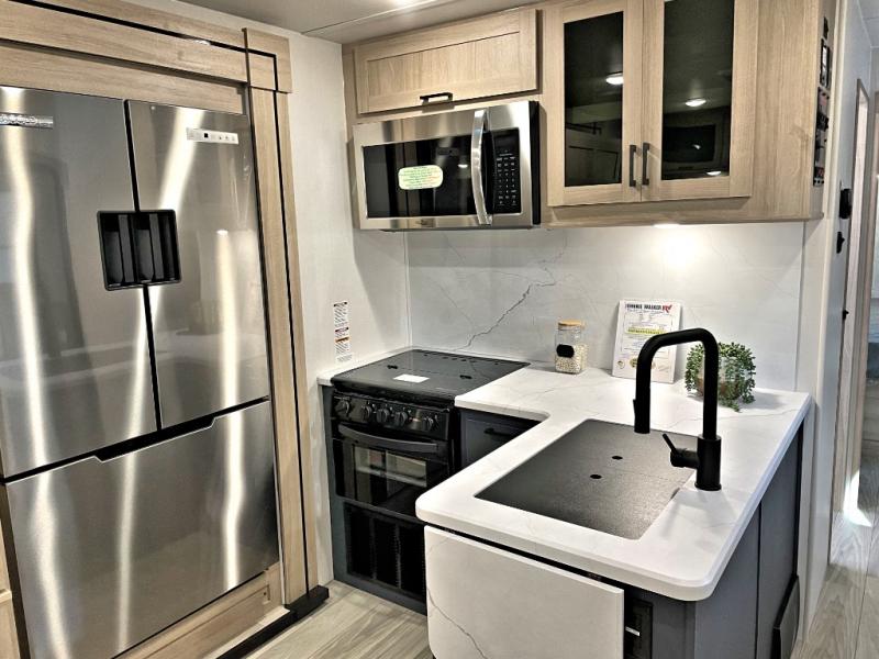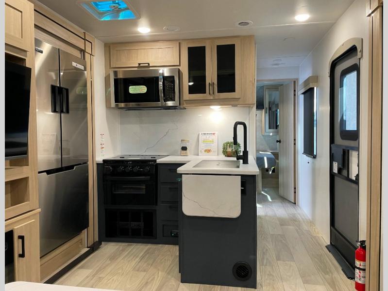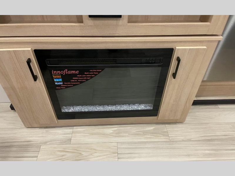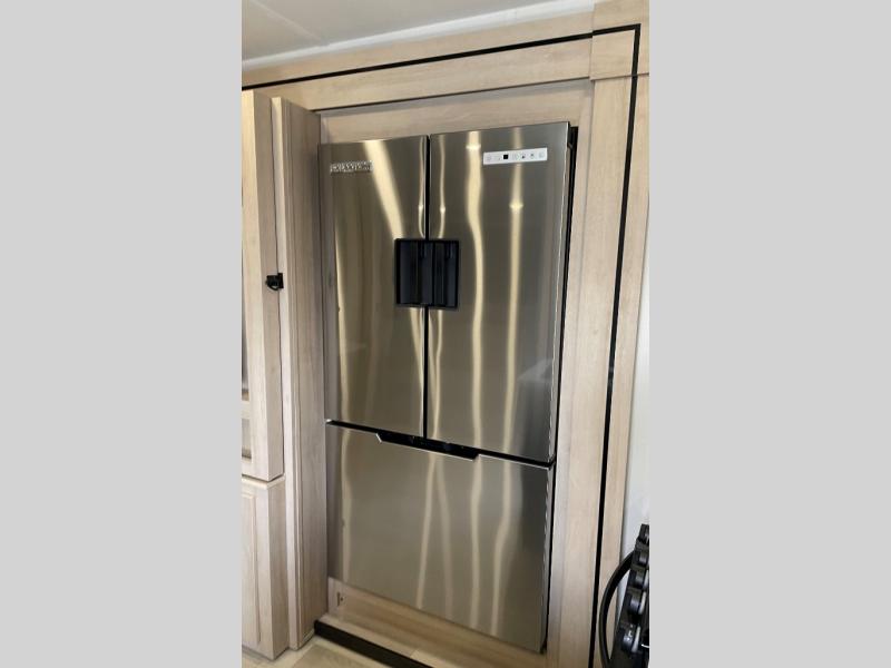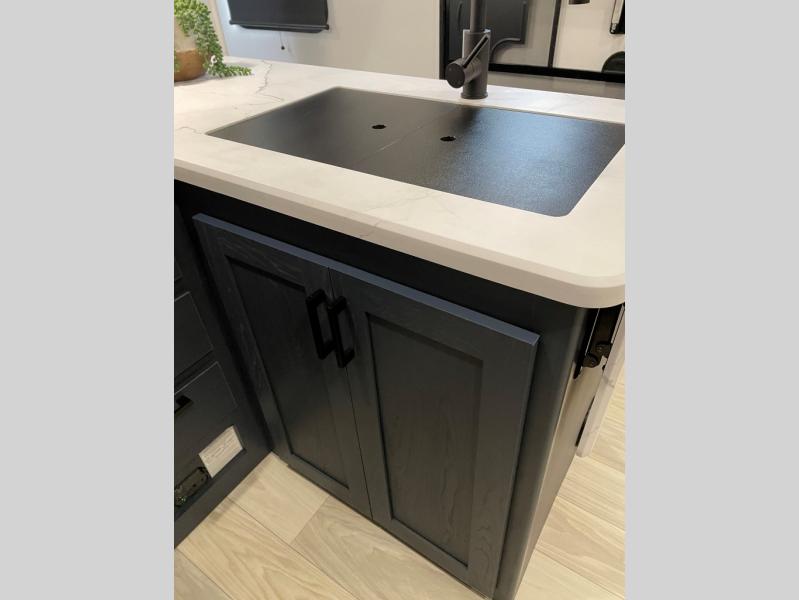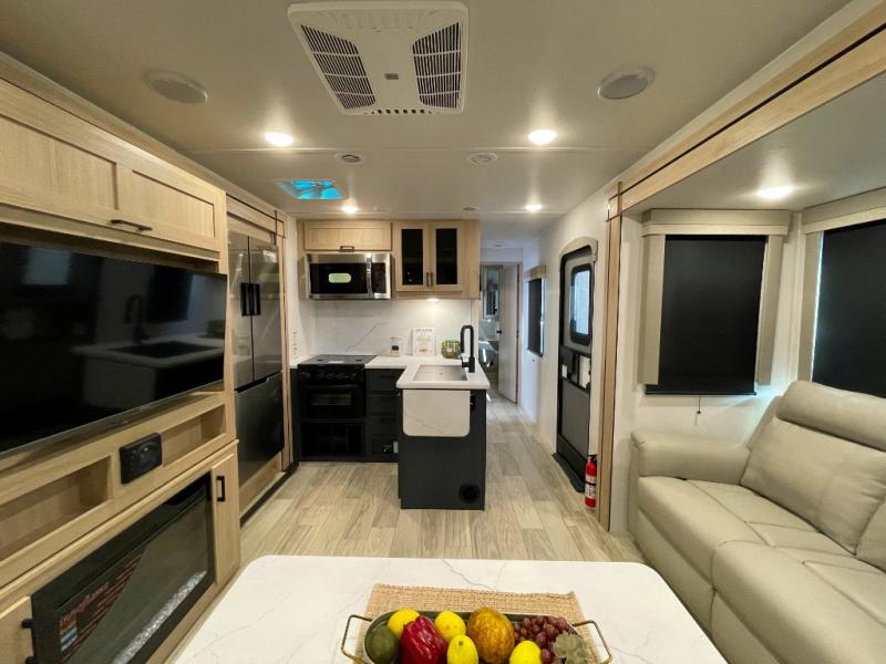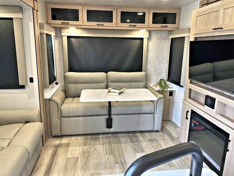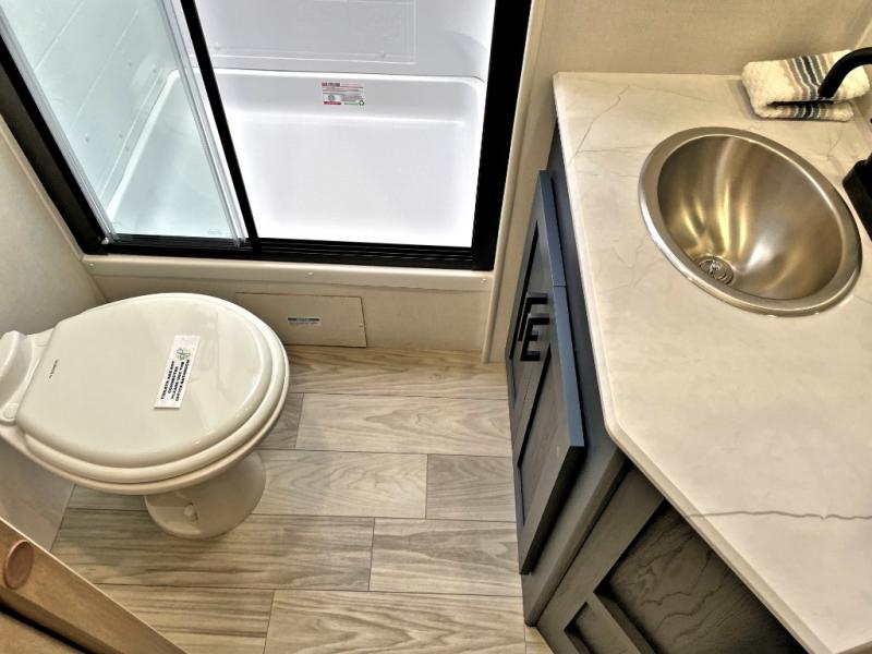 Looking to unwind indoors when you aren't hiking scenic trails? This trailer has extra gathering space in the rear living area because of the opposing slides that hold the theater seating on one side, and the hidden pantry behind the entertainment and the 15 cubic foot refrigerator on the other side. There is also a 72" tri-fold sofa in the rear with a sofa table so that you can easily keep your drinks nearby. As you get cleaned up in the full bathroom, you'll love that the large skylight brings in some extra natural lighting, and the front private bedroom will be a welcome retreat after a full day of camping. The dual bedside nightstands and wardrobes will allow you to keep things neat and tidy.