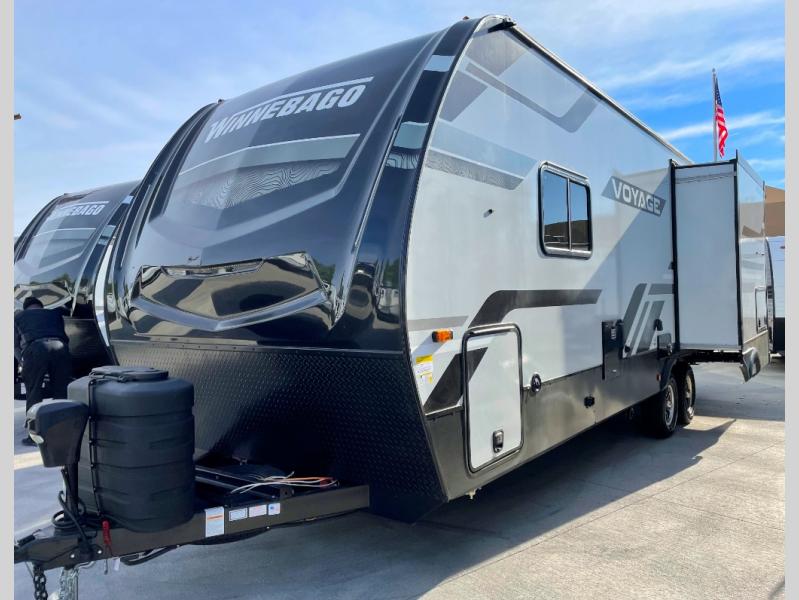 Each Voyage travel trailer by Winnebago includes a 200-watt solar panel with a 30 amp-charge controller and resettable breaker so you can camp off-grid. Also included is a heated and enclosed underbelly with radiant foil insulation for four seasons of travel, 2" thick FILON® MAX fiberglass sidewalls and a painted gel coat front cap with integrated LED lighting, a walk-on roof, plus power stabilizers for easy setup and stability. The interior offers many comforts of home, large windows, LED ceiling lights, ductless flooring throughout, and full kitchen amenities. No voyage is better than the one taken in a Voyage travel trailer! Come choose your model today!