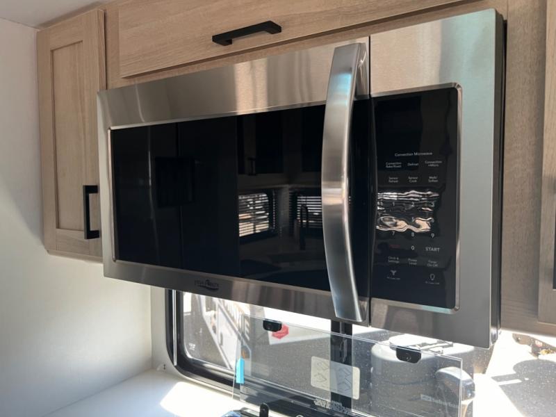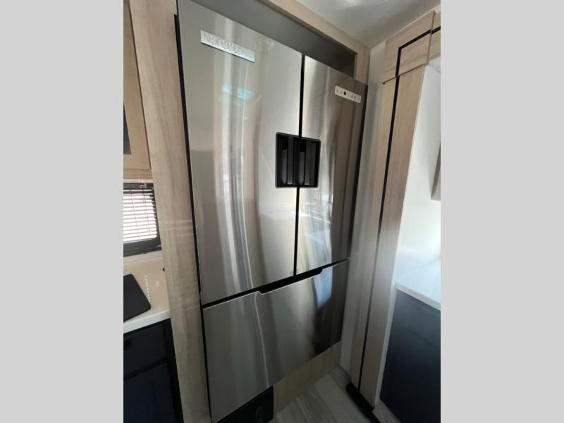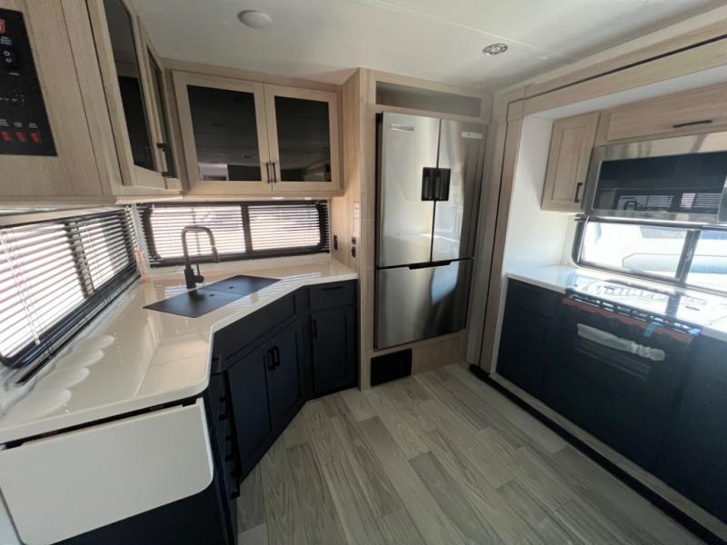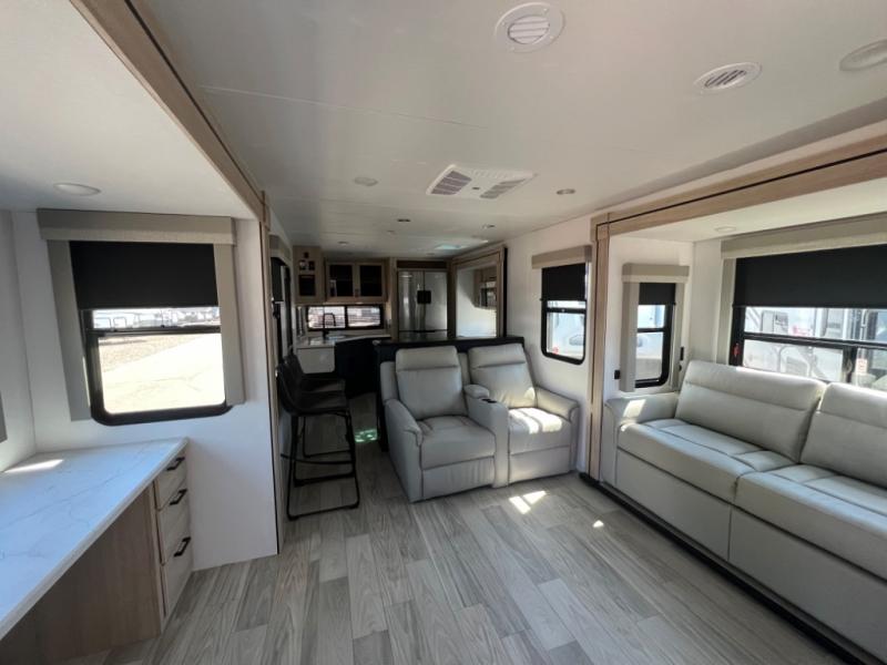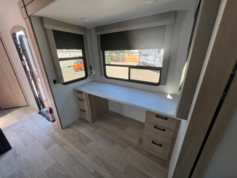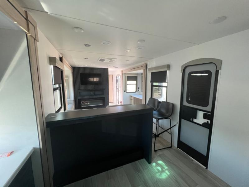 This travel trailer has many features that will surely stand out to you! The rear kitchen includes a recessed three burner cooktop slide, tons of counter space, plus a breakfast bar with stools. The middle living area will be a favorite place to relax with its dual opposing slides, tri-fold sofa with a sofa table, plus theater seats across from the Smart TV and fireplace. There is also a desk with a chair within one of the slide outs, or you can choose the optional second tri-fold sofa. A pocket door to the full bath will help save on space, and the front private bedroom is sure to be accommodating with its queen bed, dual nightstands and wardrobes, plus underbed storage for extra blankets or your bags! If you'd like a little more space to stretch out in bed, just choose the optional king bed in place of the queen bed!