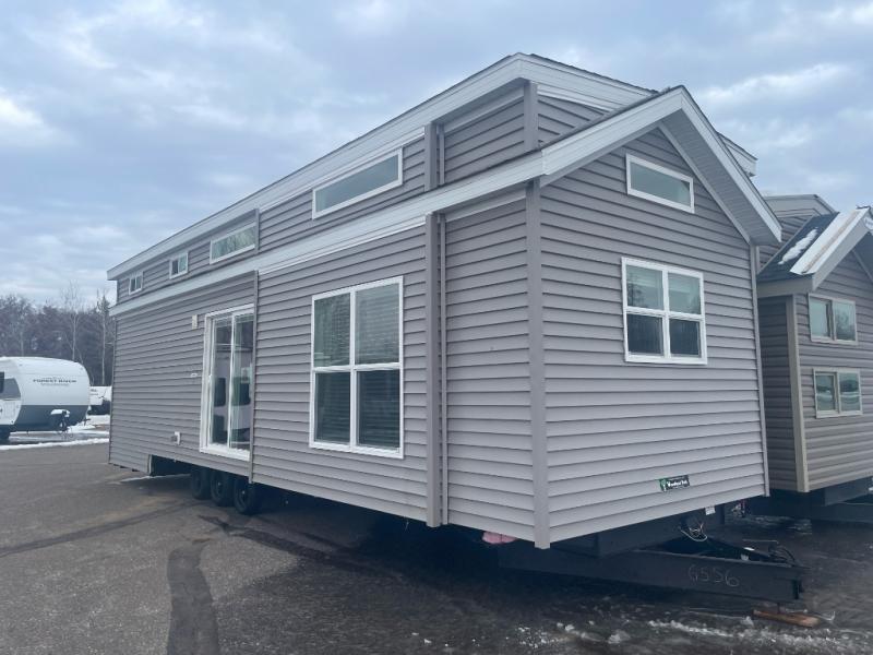Shed dormers add character to this park model from Timber Ridge. The second story loft area adds extra space, while the private rear bedroom is a secluded retreat. You will appreciate the night stands with USB ports, dual wardrobes, and LED lights. The open living area features an entertainment center with bookshelf and wall-mounted TV, which you can also watch from the three stools at the breakfast bar in the kitchen. A 72" x 76" patio door provides a welcoming entry complete with a porch light.