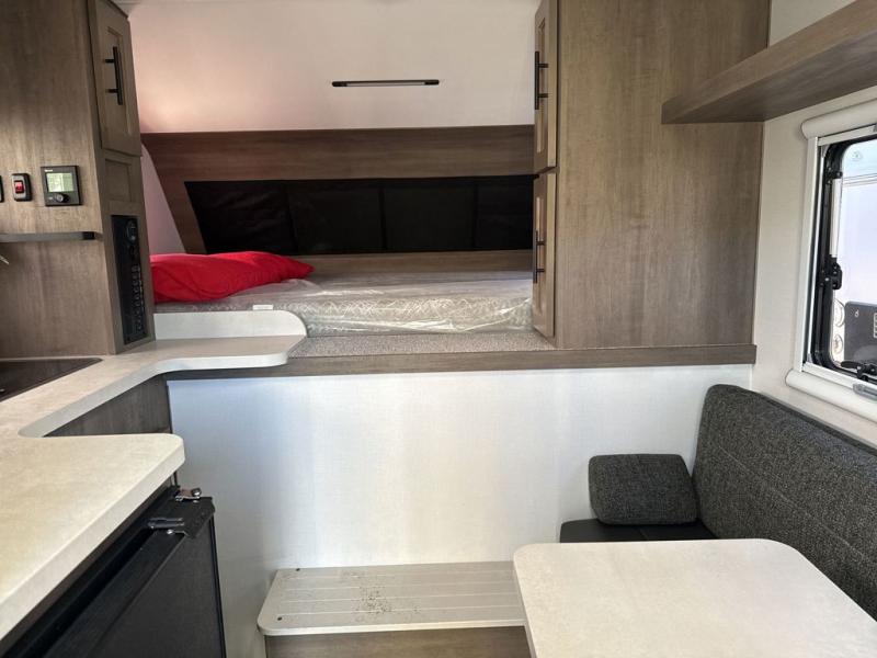 This true half-ton truck camper is lightweight, but not light on features! You can easily sleep up to five each night with the front queen bed and roll-over sofa, plus an optional bunk! The adventure locker/wet bathroom is a waterproof, modular space that doubles as a heated gear locker, making this space more versatile! In the kitchen you can make meals on the two burner stove with an integrated sink plus a Nova Kool 3.1 cu. ft. refrigerator with a freezer compartment. This unit also includes an Unbound Power Tower (UPT) with USB ports to keep you powered up, plus you can choose solar power options for off-grid capability!