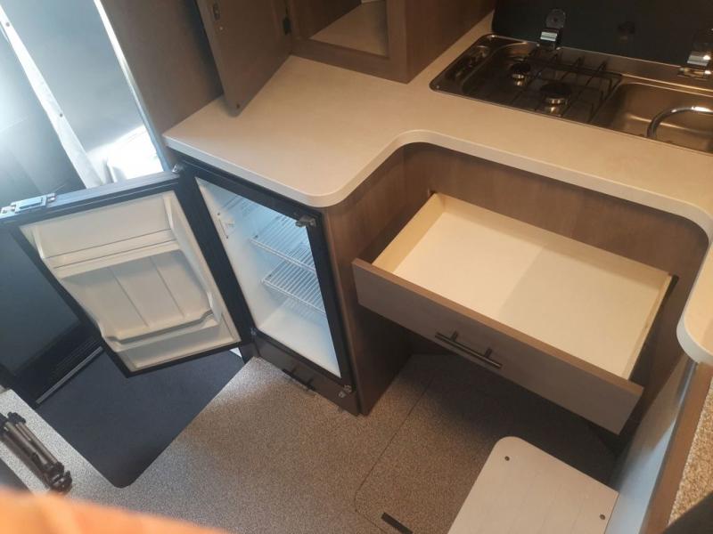 The 65RBOE is loaded with a 12V 3.1 cubic foot fridge w/freezer compartment. A 2 burner stove with integrated sink. Heating is no problem with a Tuma Combi Eco furnace w/water heater. On a hotter day, stay cool with the 13,500 BTU air conditioner.