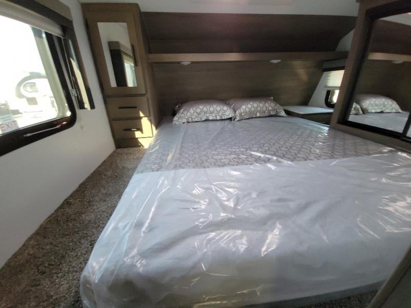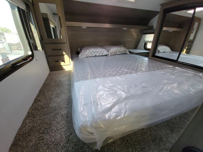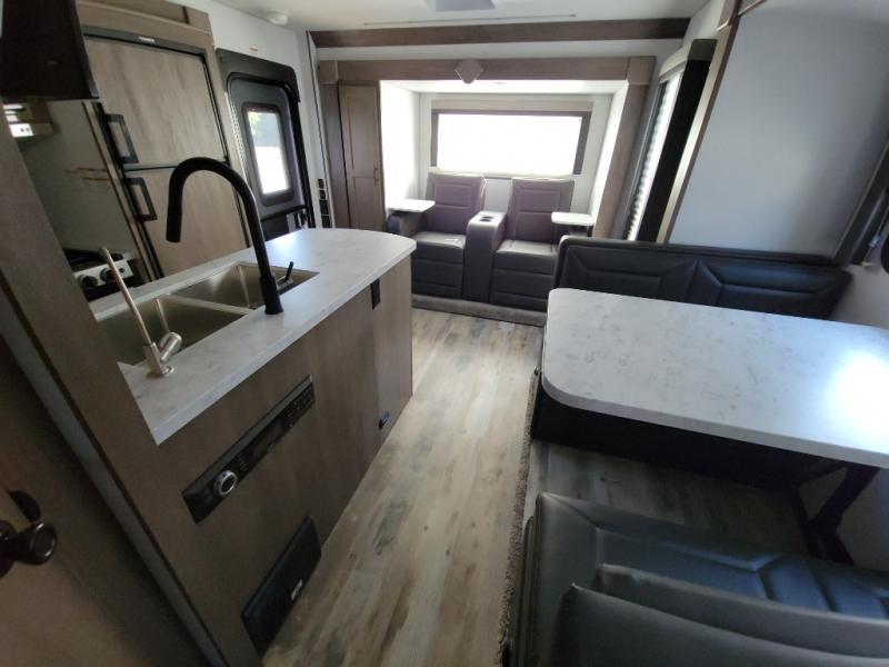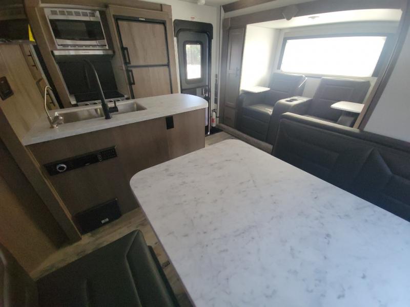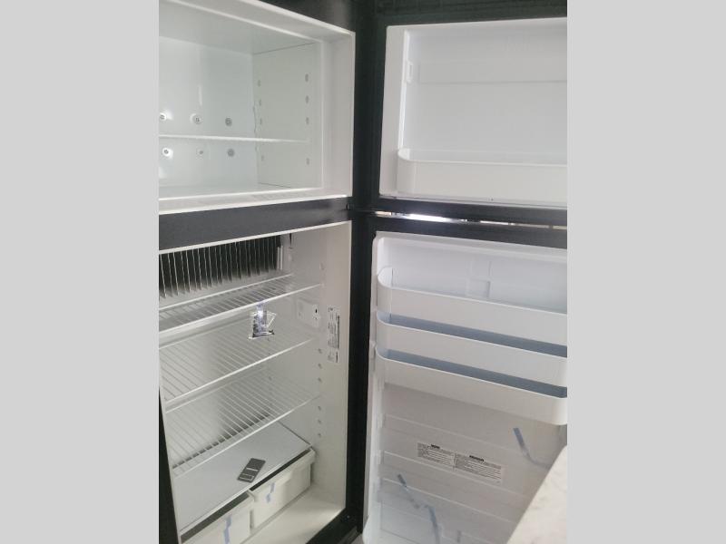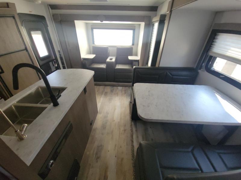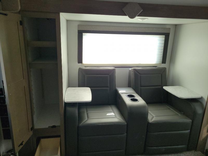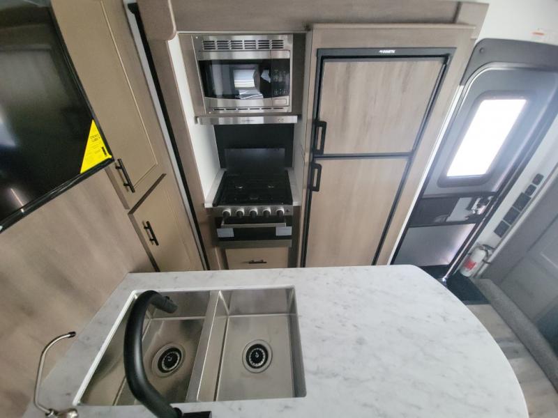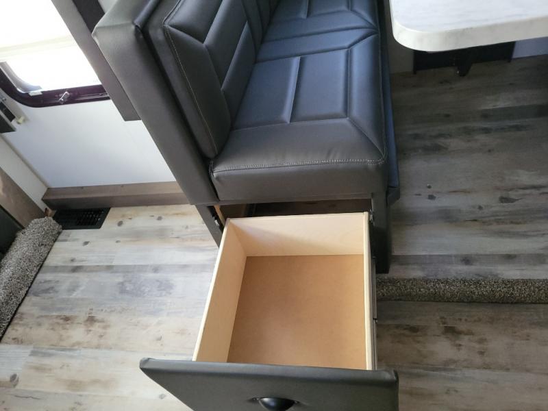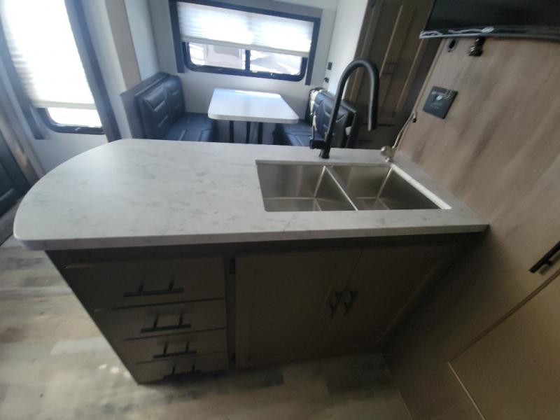 The thoughtfully designed peninsula kitchen features granite-coat countertops, deep drawer storage, and full-size appliances, giving you everything you need to cook comfortably on the road. It’s a chef-inspired layout that maximizes prep space without compromising room to move.