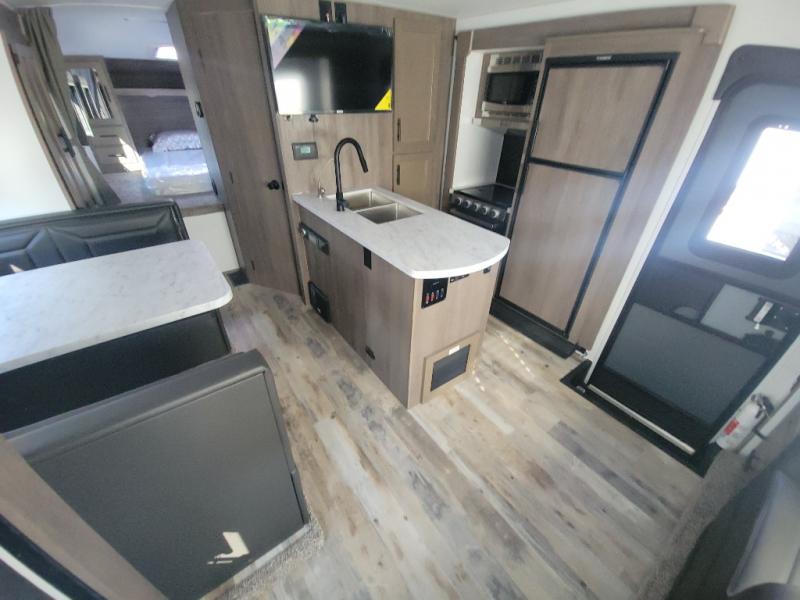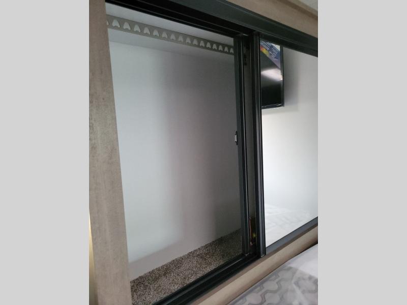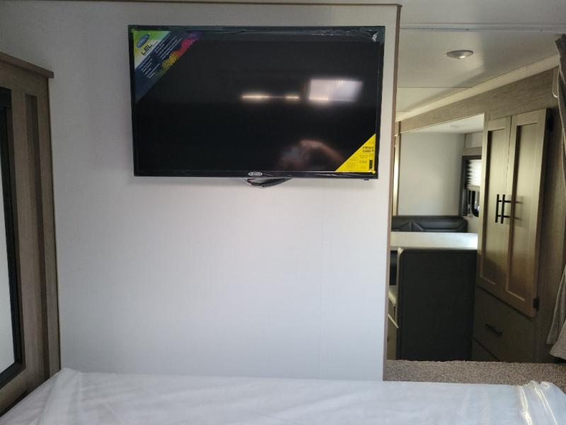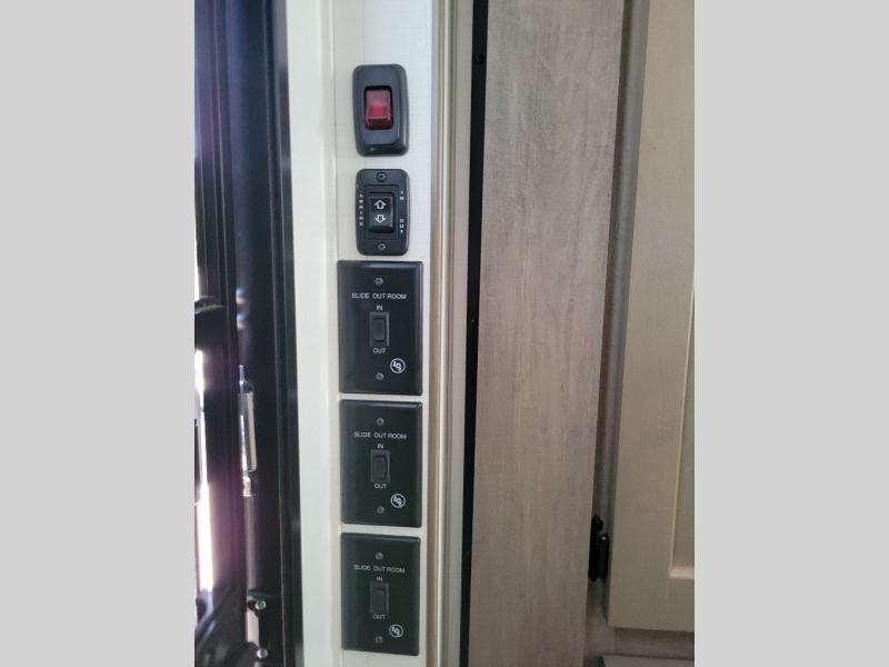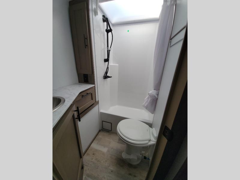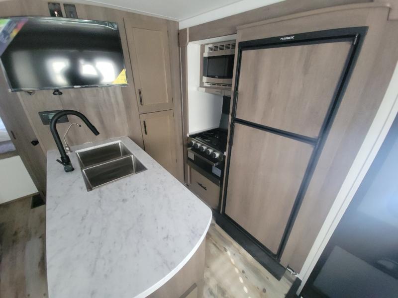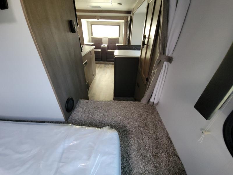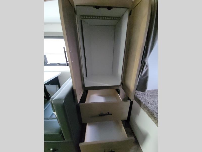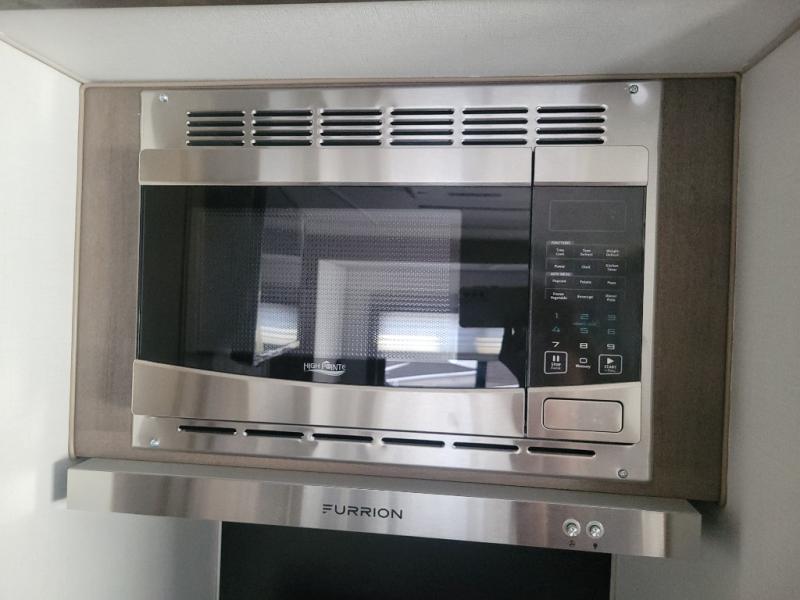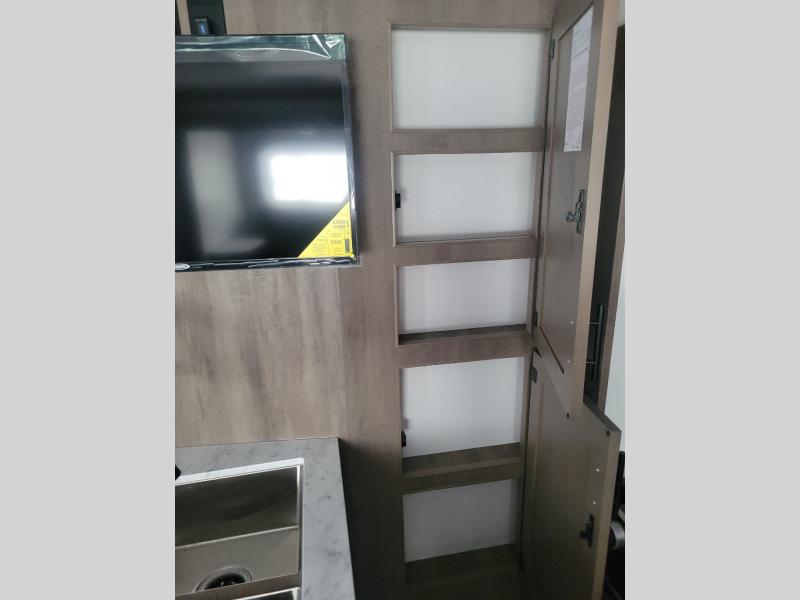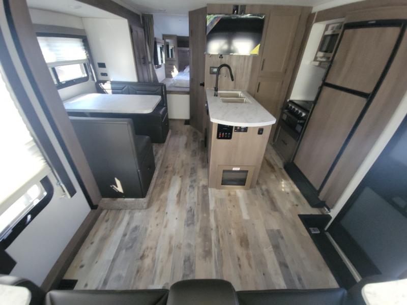 The thoughtfully designed peninsula kitchen features granite-coat countertops, deep drawer storage, and full-size appliances, giving you everything you need to cook comfortably on the road. It’s a chef-inspired layout that maximizes prep space without compromising room to move.