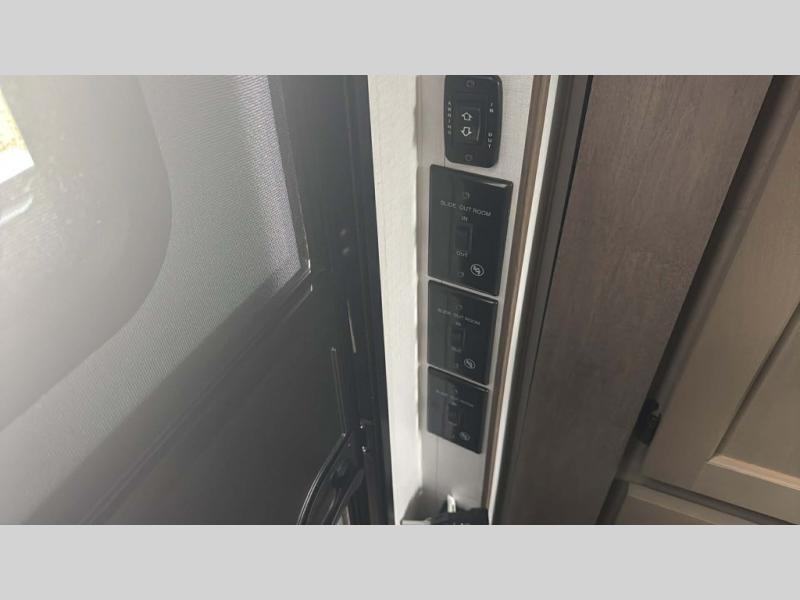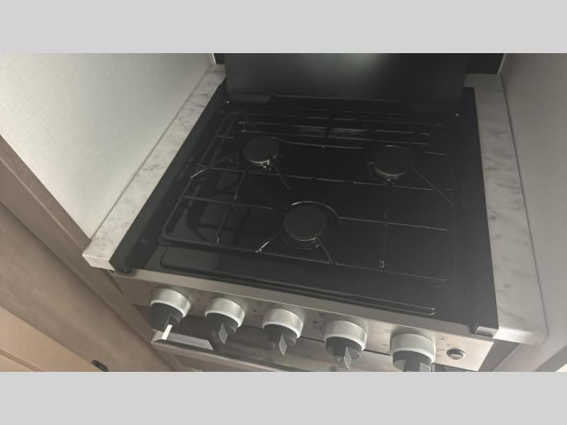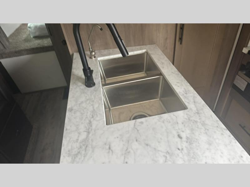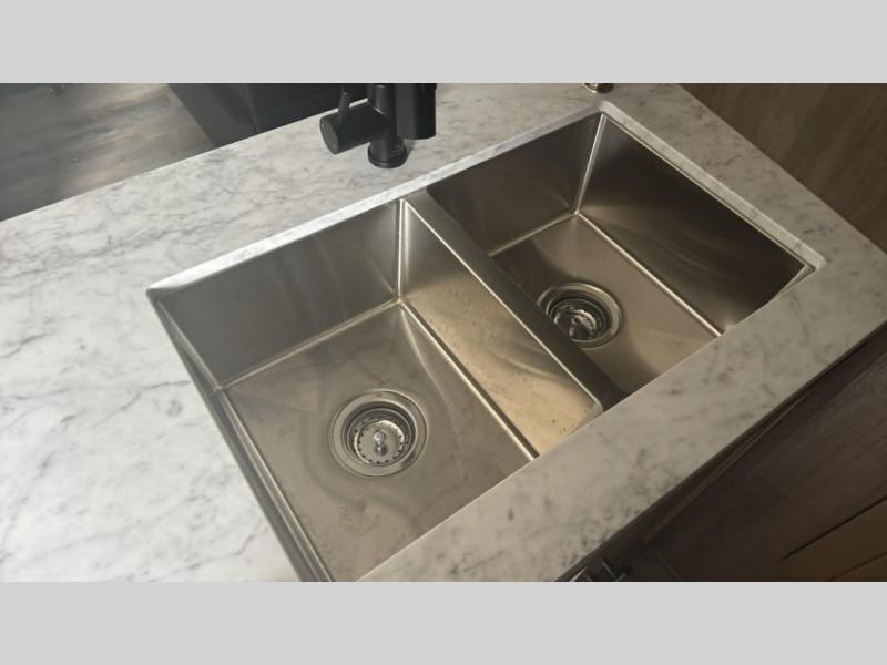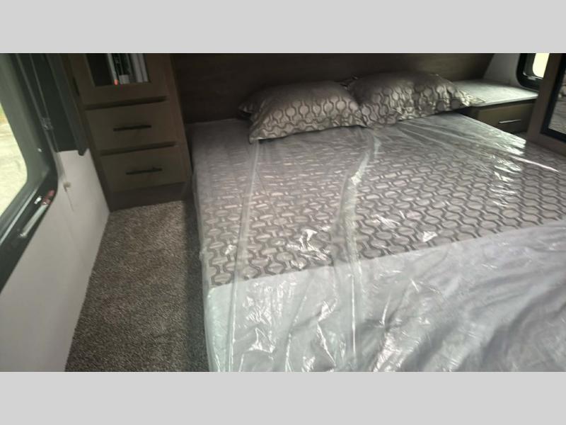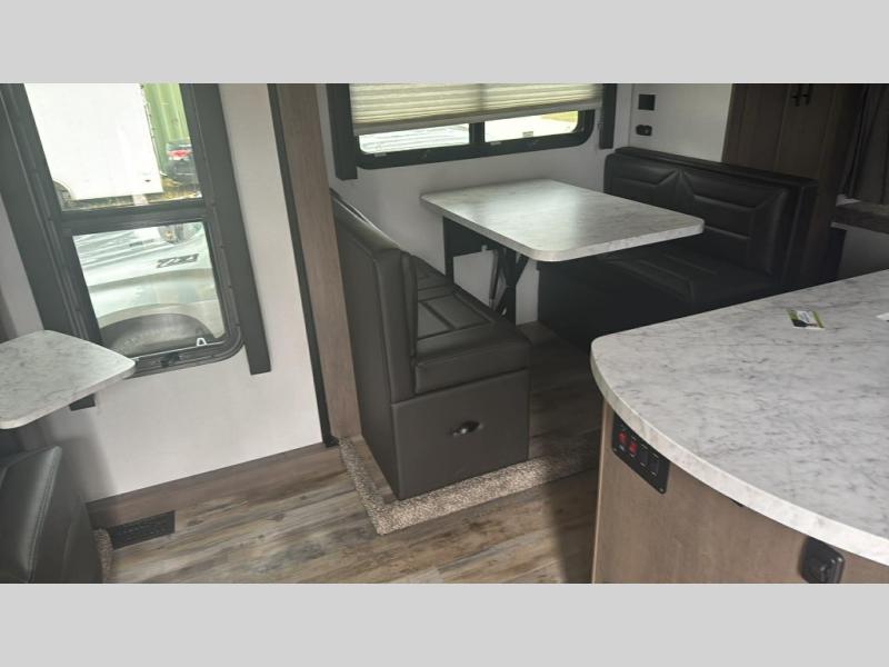 The thoughtfully designed peninsula kitchen features granite-coat countertops, deep drawer storage, and full-size appliances, giving you everything you need to cook comfortably on the road. It’s a chef-inspired layout that maximizes prep space without compromising room to move.
