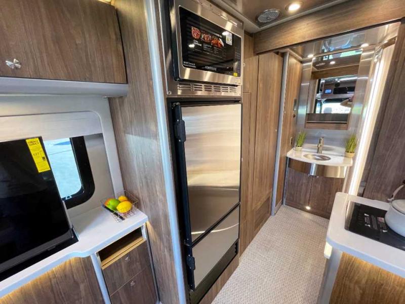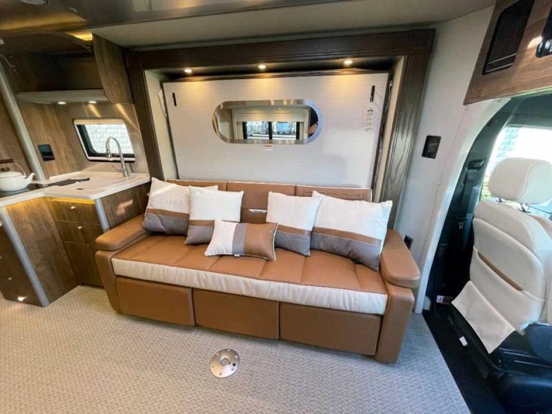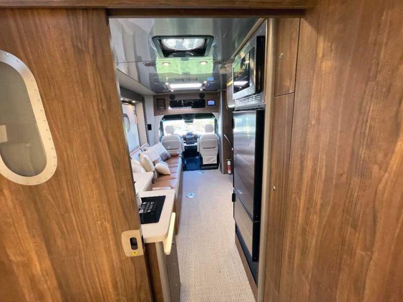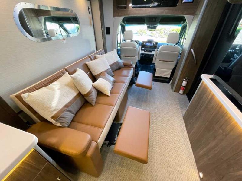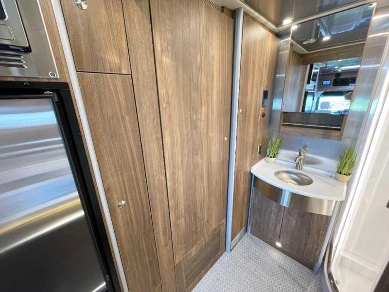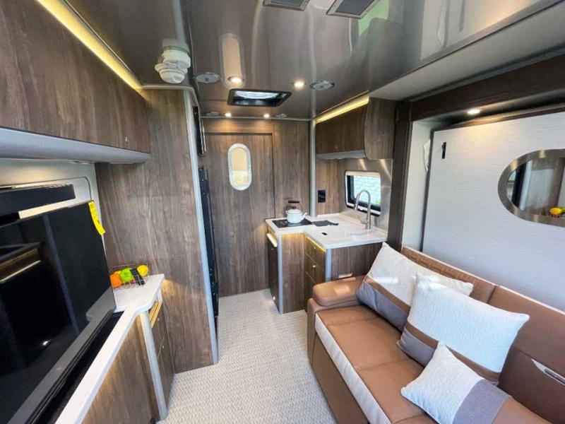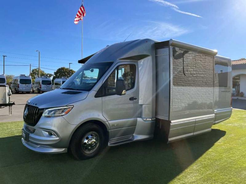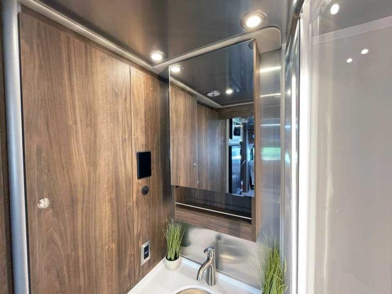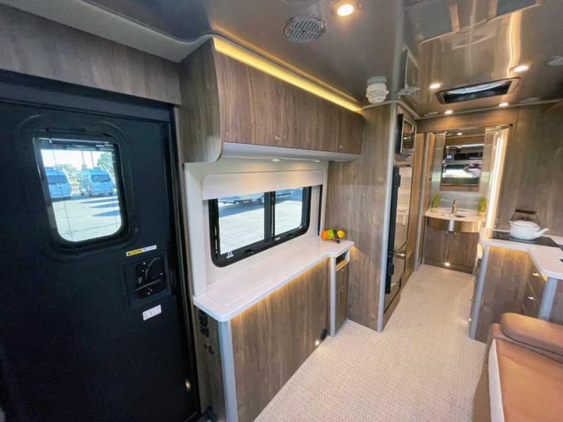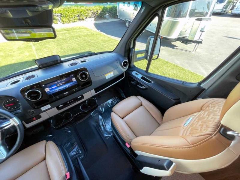 With the Atlas 25MS Class B+ diesel motorhome by Airstream, you not only get an enduring Airstream design, conveniences and luxury features, but also the proven Mercedes-Benz safety systems and performance. The coach is built with Azdel composite roof, floor, and wall material, a vacuum-bonded aluminum framed floor, radius walls, a fiberglass crowned roof for extra headroom, trimless smooth fiberglass body seams, and molded fiberglass front and rear caps. And the Mercedes-Benz 2.0L turbo charged 4-cyliner high-output diesel engine will power your many excursions! The main cabin offers adjustable LED lighting, flush-mount cabinet hardware and soft close doors, a Froli ergonomic bed support system for a good night's sleep. You will enjoy Ultraleather seating, USB charging ports for your electronics, marine woven synthetic flooring, and matte finish laminate cabinetry to mention a few highlights.