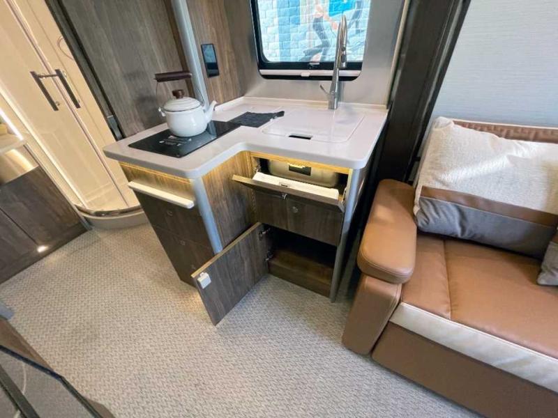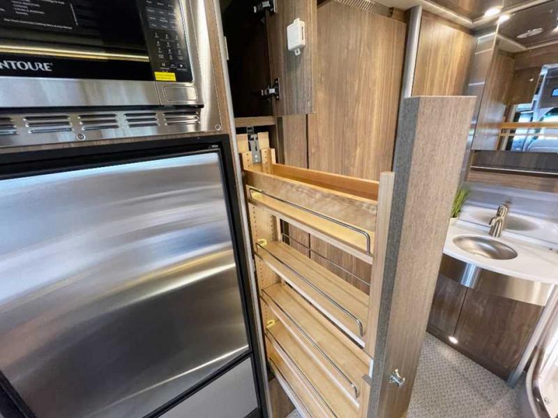 Get ready to explore, unwind and "glamp" where ever you decide! This coach brings you everything you will need, plus much much more! The power slide offers a Murphy suite that retracts and fits seamlessly with the luxury automotive body style. With a touch of a button on the multiplex control panel, you will have more floor space to relax on the reclining sofa that includes two seatbelts or pull down the Murphy bed at night. There is more seating on the captain's chairs that swivel around to face the interior, and there are two tables that adjust to different heights for your needs. The kitchen provides a cooktop and large stainless steel Kohler sink and faucet, and there is a convection microwave, a slide-out pantry and a refrigerator with a freezer a few steps away.