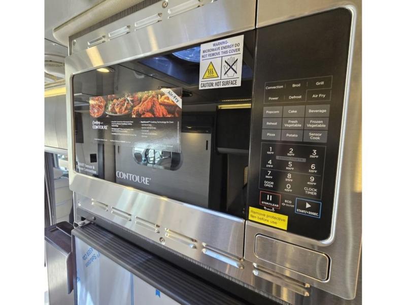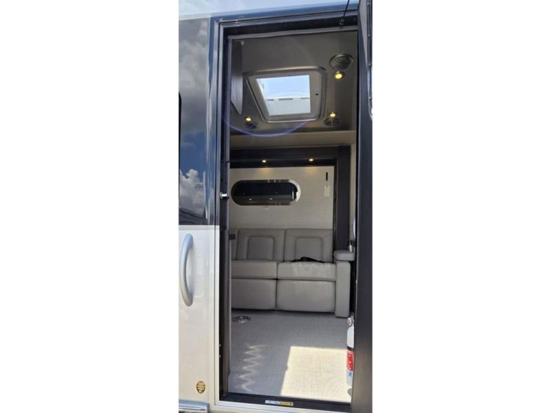 Get ready to explore, unwind and "glamp" where ever you decide! This coach brings you everything you will need, plus much much more! The power slide offers a Murphy suite that retracts and fits seamlessly with the luxury automotive body style. With a touch of a button on the multiplex control panel, you will have more floor space to relax on the reclining sofa that includes two seatbelts or pull down the Murphy bed at night. There is more seating on the captain's chairs that swivel around to face the interior, and there are two tables that adjust to different heights for your needs. The kitchen provides a cooktop and large stainless steel Kohler sink and faucet, and there is a convection microwave, a slide-out pantry and a refrigerator with a freezer a few steps away.