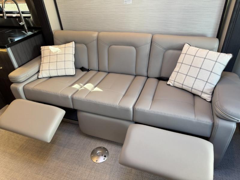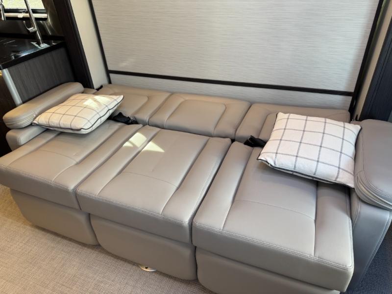 Get ready to explore, unwind and "glamp" where ever you decide! This coach brings you everything you will need, plus much much more! The power slide offers a Murphy suite that retracts and fits seamlessly with the luxury automotive body style. With a touch of a button on the multiplex control panel, you will have more floor space to relax on the reclining sofa that includes two seatbelts or pull down the Murphy bed at night. There is more seating on the captain's chairs that swivel around to face the interior, and there are two tables that adjust to different heights for your needs. The kitchen provides a cooktop and large stainless steel Kohler sink and faucet, and there is a convection microwave, a slide-out pantry and a refrigerator with a freezer a few steps away.