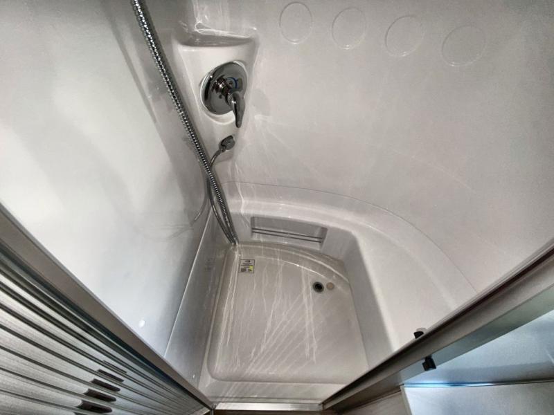 A wide, full-size bath gives you separate shower space, roomy changing area, and added privacy at camp.