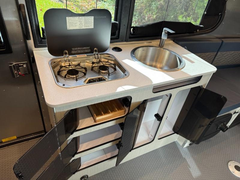 This travel trailer is ready for adventure when you are! You can easily sleep everyone when using both the rear benches and the front U-shaped dinette. The benches provide split sleeping or a half-bed on one side and a full bed that spans the back of the trailer into an 82" x 78" sleeping area. There is storage under the cushions for the two removable tables that allow you to dine, work and relax with a place for your cellphones and such. The wet bath comes complete with a shower, sink and toilet so you can rinse off from a day outdoors, the galley kitchen gives the cook a place to make warm meals and store drinks and leftovers. This Basecamp also offers front panoramic windows, a steel double entry step, a full-size spare tire, and a rear hatch door allowing you to take your snowboards, skis, and paddle boards.