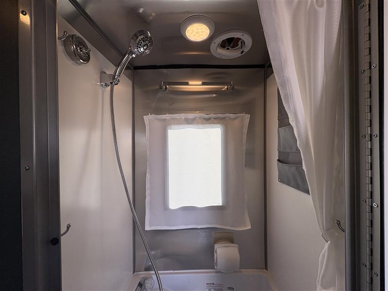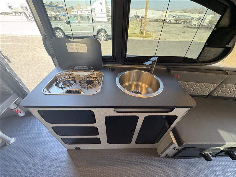 This travel trailer is ready for adventure when you are! You can easily sleep everyone when using both the rear benches and the front U-shaped dinette. The benches provide split sleeping or a half-bed on one side and a full bed that spans the back of the trailer into an 82" x 78" sleeping area. There is storage under the cushions for the two removable tables that allow you to dine, work and relax with a place for your cellphones and such. The wet bath comes complete with a shower, sink and toilet so you can rinse off from a day outdoors, the galley kitchen gives the cook a place to make warm meals and store drinks and leftovers. This Basecamp also offers front panoramic windows, a steel double entry step, a full-size spare tire, and a rear hatch door allowing you to take your snowboards, skis, and paddle boards.