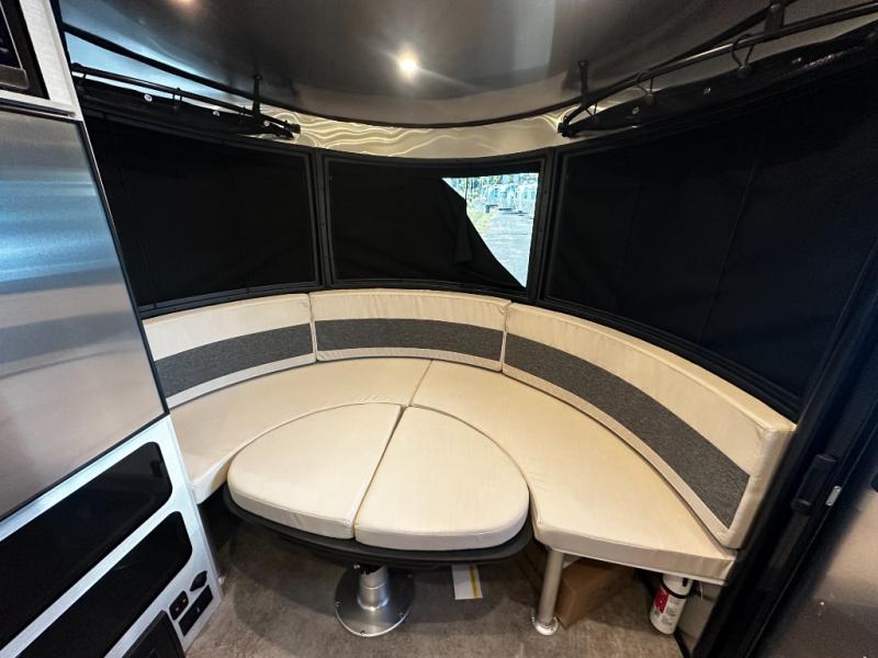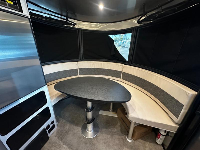 Built for off-road adventures, the Basecamp 20XE features the “X” off-road package with a 3-inch lift, all-terrain tires, and protective front stone guards—ready to handle rough terrain while keeping you safe and confident. Despite its rugged exterior, the interior is thoughtfully designed for comfort and convenience. The rear convertible dinette easily transforms into a spacious bed, while the front seating area provides room for dining, work, or relaxation.