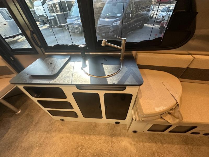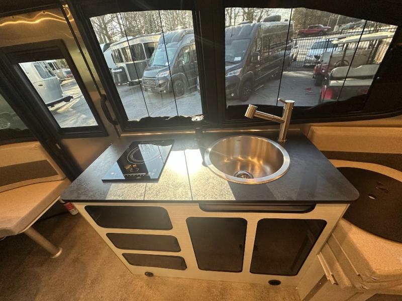 Chart a new map with this travel trailer in tow! Once you arrive at your destination, you can unload your gear, then start lunch on the single burner induction cooktop. An all-electric refrigerator lets you store cold items, and an optional microwave can be added for added convenience. You'll find bench seating in the back with removable tables that can be adjusted to different heights and directions. When it's time for bed, the benches can be converted to a half bed on one side, a full bed that spans the back of the unit, or a split sleeping area. A rear door gives you quick and easy access to your built-in floor storage with a drain, doubling it as a cooler!