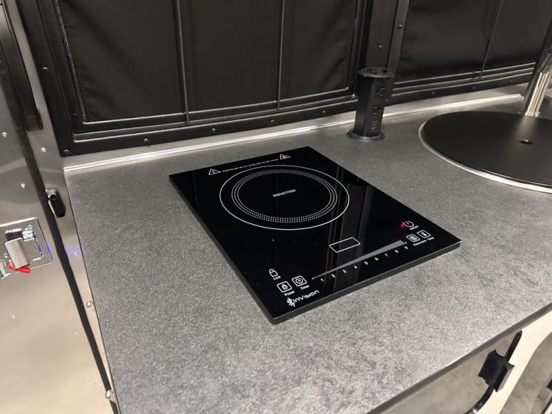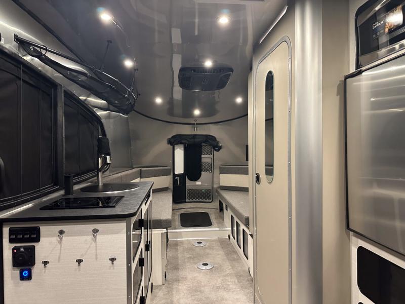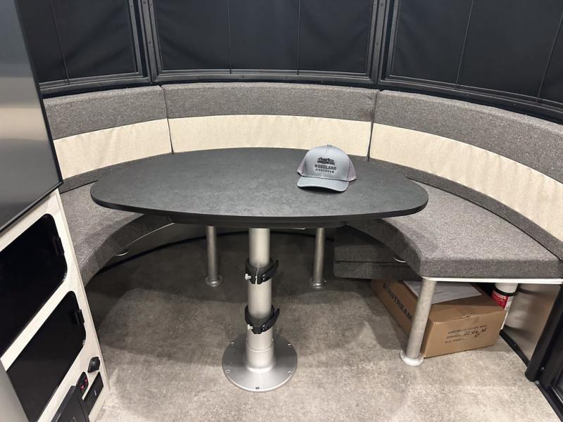 Chart a new map with this travel trailer in tow! Once you arrive at your destination, you can unload your gear, then start lunch on the single burner induction cooktop. An all-electric refrigerator lets you store cold items, and an optional microwave can be added for added convenience. You'll find bench seating in the back with removable tables that can be adjusted to different heights and directions. When it's time for bed, the benches can be converted to a half bed on one side, a full bed that spans the back of the unit, or a split sleeping area. A rear door gives you quick and easy access to your built-in floor storage with a drain, doubling it as a cooler!