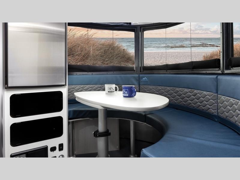 This travel trailer is ready for adventure when you are! You can easily sleep everyone when using both the rear benches and the front U-shaped dinette. The benches provide split sleeping or a half-bed on one side and a full bed that spans the back of the trailer into an 82" x 78" sleeping area. There is storage under the cushions for the two removable tables that allow you to dine, work and relax with a place for your cellphones and such. The wet bath comes complete with a shower, sink and toilet so you can rinse off from a day outdoors, the galley kitchen gives the cook a place to make warm meals and store drinks and leftovers. This Basecamp also offers front panoramic windows, a steel double entry step, a full-size spare tire, and a rear hatch door allowing you to take your snowboards, skis, and paddle boards.