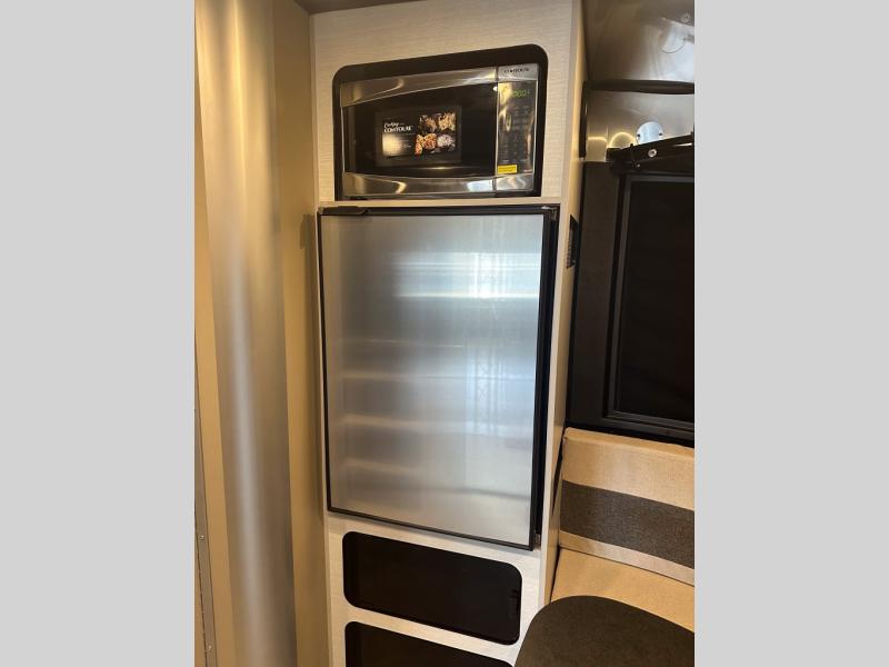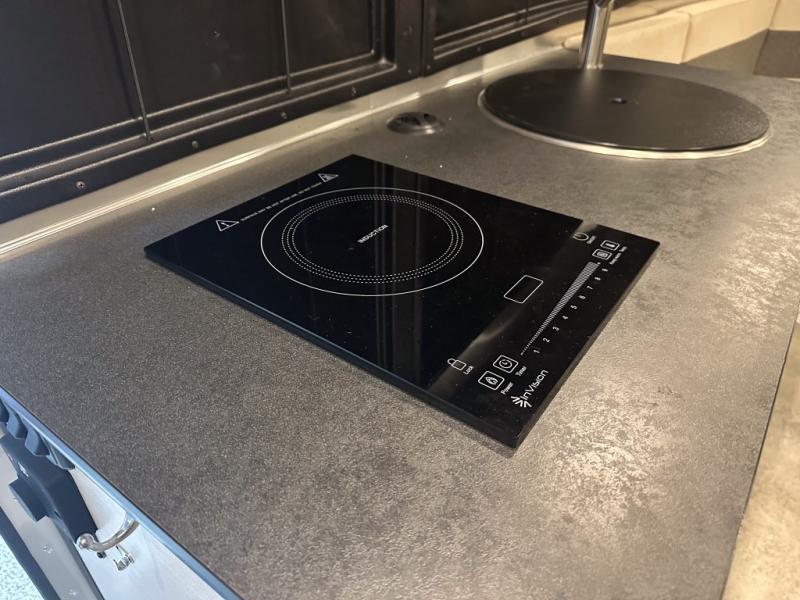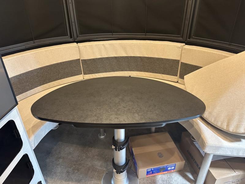 Chart a new map with this travel trailer in tow! Once you arrive at your destination, you can unload your gear, then start lunch on the single burner induction cooktop. An all-electric refrigerator lets you store cold items, and an optional microwave can be added for added convenience. You'll find bench seating in the back with removable tables that can be adjusted to different heights and directions. When it's time for bed, the benches can be converted to a half bed on one side, a full bed that spans the back of the unit, or a split sleeping area. A rear door gives you quick and easy access to your built-in floor storage with a drain, doubling it as a cooler!