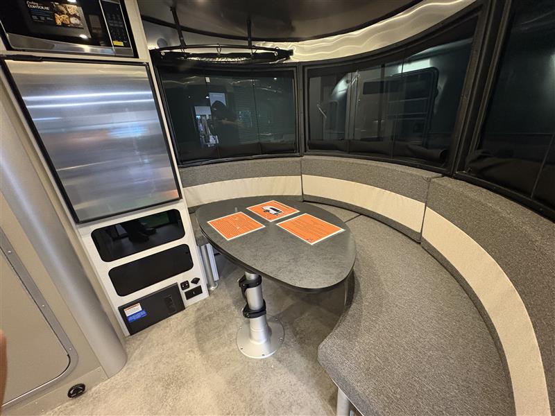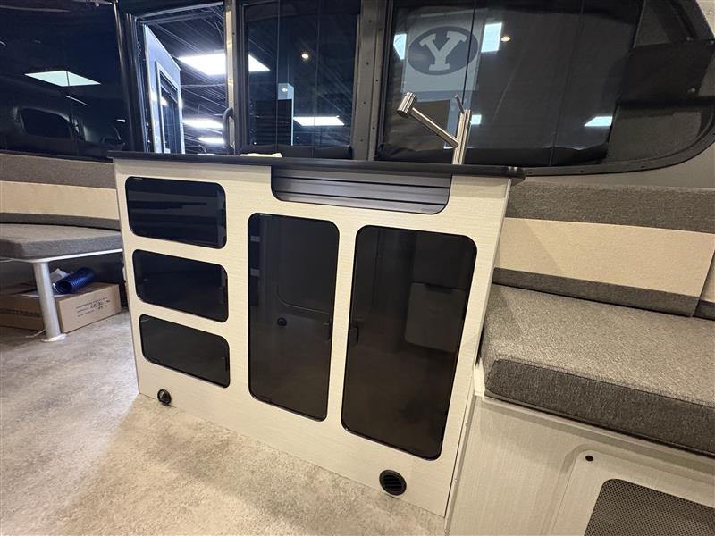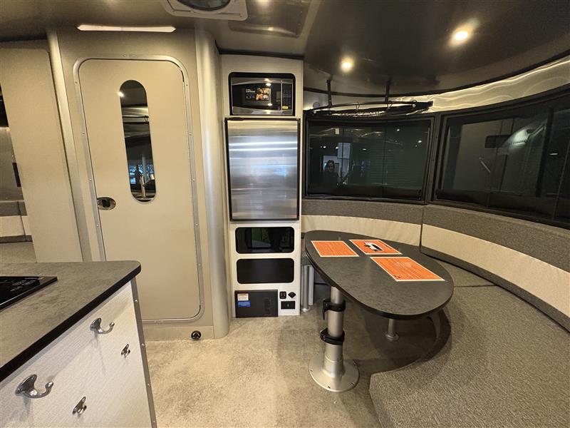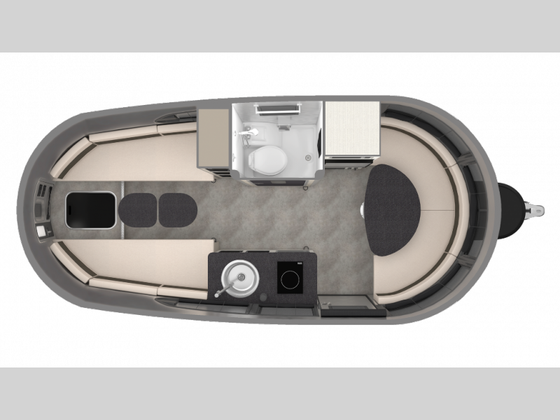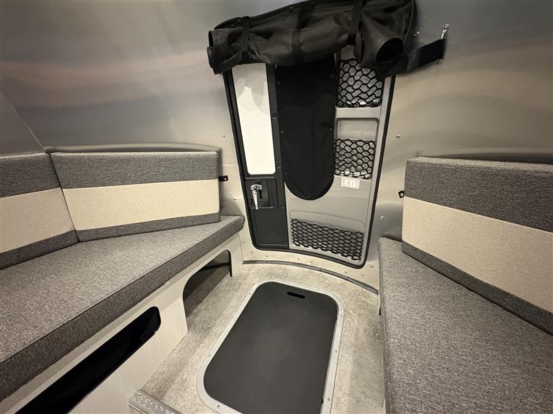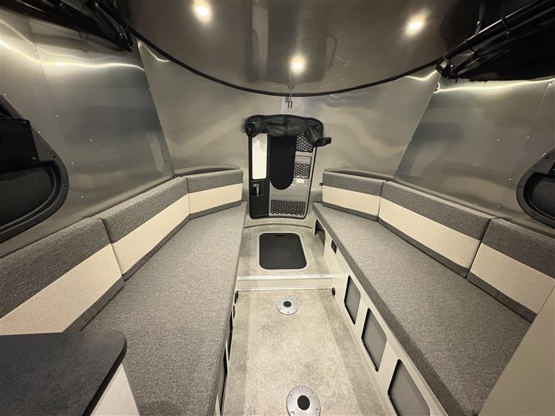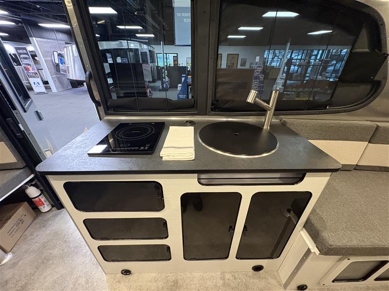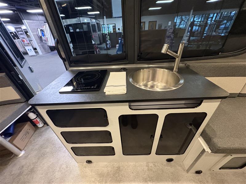 Chart a new map with this travel trailer in tow! Once you arrive at your destination, you can unload your gear, then start lunch on the single burner induction cooktop. An all-electric refrigerator lets you store cold items, and an optional microwave can be added for added convenience. You'll find bench seating in the back with removable tables that can be adjusted to different heights and directions. When it's time for bed, the benches can be converted to a half bed on one side, a full bed that spans the back of the unit, or a split sleeping area. A rear door gives you quick and easy access to your built-in floor storage with a drain, doubling it as a cooler!