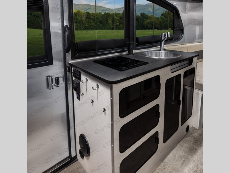 Chart a new map with this travel trailer in tow! Once you arrive at your destination, you can unload your gear, then start lunch on the single burner induction cooktop. An all-electric refrigerator lets you store cold items, and an optional microwave can be added for added convenience. You'll find bench seating in the back with removable tables that can be adjusted to different heights and directions. When it's time for bed, the benches can be converted to a half bed on one side, a full bed that spans the back of the unit, or a split sleeping area. A rear door gives you quick and easy access to your built-in floor storage with a drain, doubling it as a cooler!