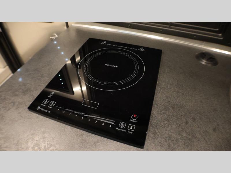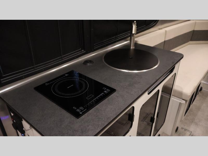Chart a new map with this travel trailer in tow! Once you arrive at your destination, you can unload your gear, then start lunch on the single burner induction cooktop. An all-electric refrigerator lets you store cold items, and an optional microwave can be added for added convenience. You'll find bench seating in the back with removable tables that can be adjusted to different heights and directions. When it's time for bed, the benches can be converted to a half bed on one side, a full bed that spans the back of the unit, or a split sleeping area. A rear door gives you quick and easy access to your built-in floor storage with a drain, doubling it as a cooler!