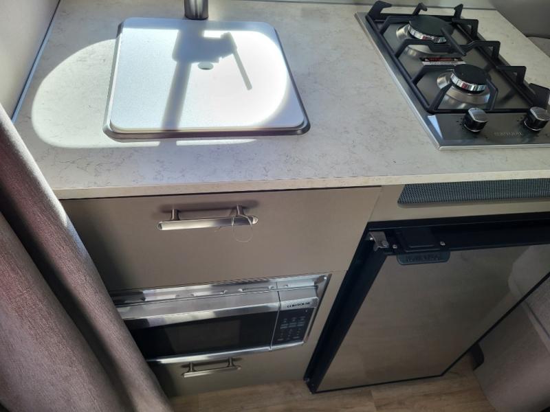 This easy-to-tow Caravel travel trailer is super capable and super durable! The kitchen features a two-burner gas cooktop, a stainless steel sink, a microwave, and a Baraldi cooking vent with light. You'll find storage space in the hanging closet next to the kitchen and the under-bed storage. And the pillowtop memory foam mattress is going to provide you with a very comfortable night of sleep.
