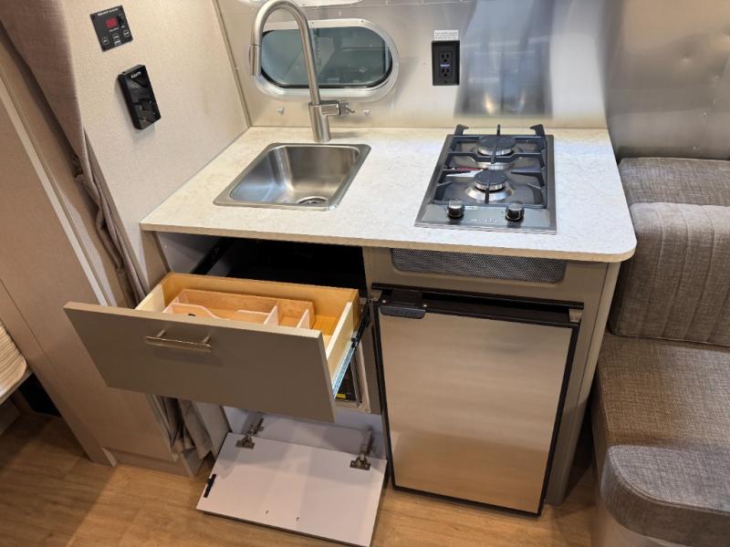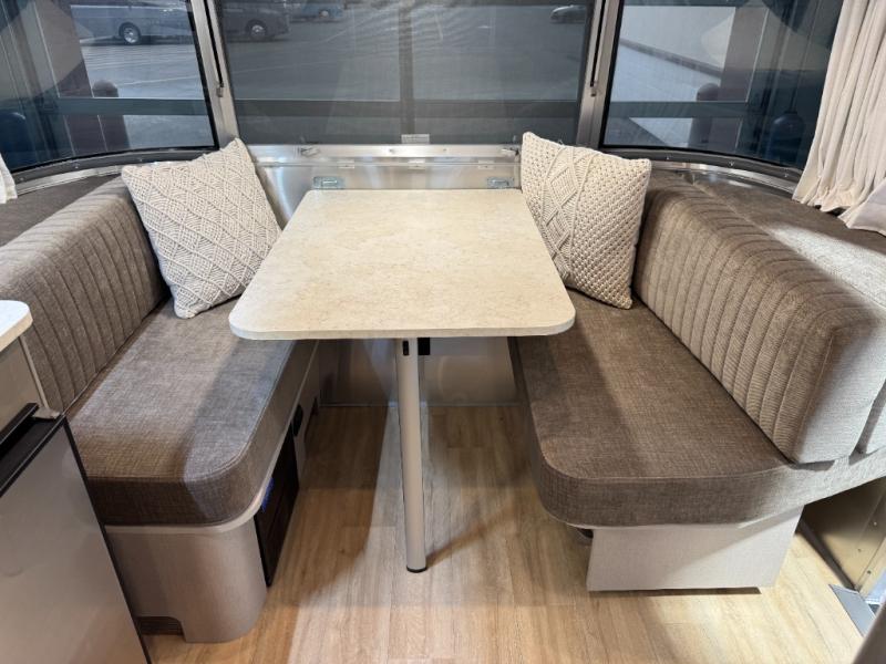 You'll always have a stylish and comfortable place to stay with the Airstream Caravel travel trailer! The manual Zip Dee patio awning can be paired with matching optional window awnings that can help keep the interior cool and private. The rear polished bumper with storage will help you keep your tools, cords, and more hidden away in a bonus storage space, and the JL Audio stereo with Bluetooth connectivity and four speakers, surround sound, and subwoofer will play your music throughout the trailer. You can stay powered while off the grid If you add the optional solar package, depending on the model you choose, and the blackout curtains will let you have privacy when you head to bed. The stainless steel front stone guard protection will prevent damage to the body of your trailer while towing, and the panoramic windows will make the interior fresh and bright with natural sunlight.